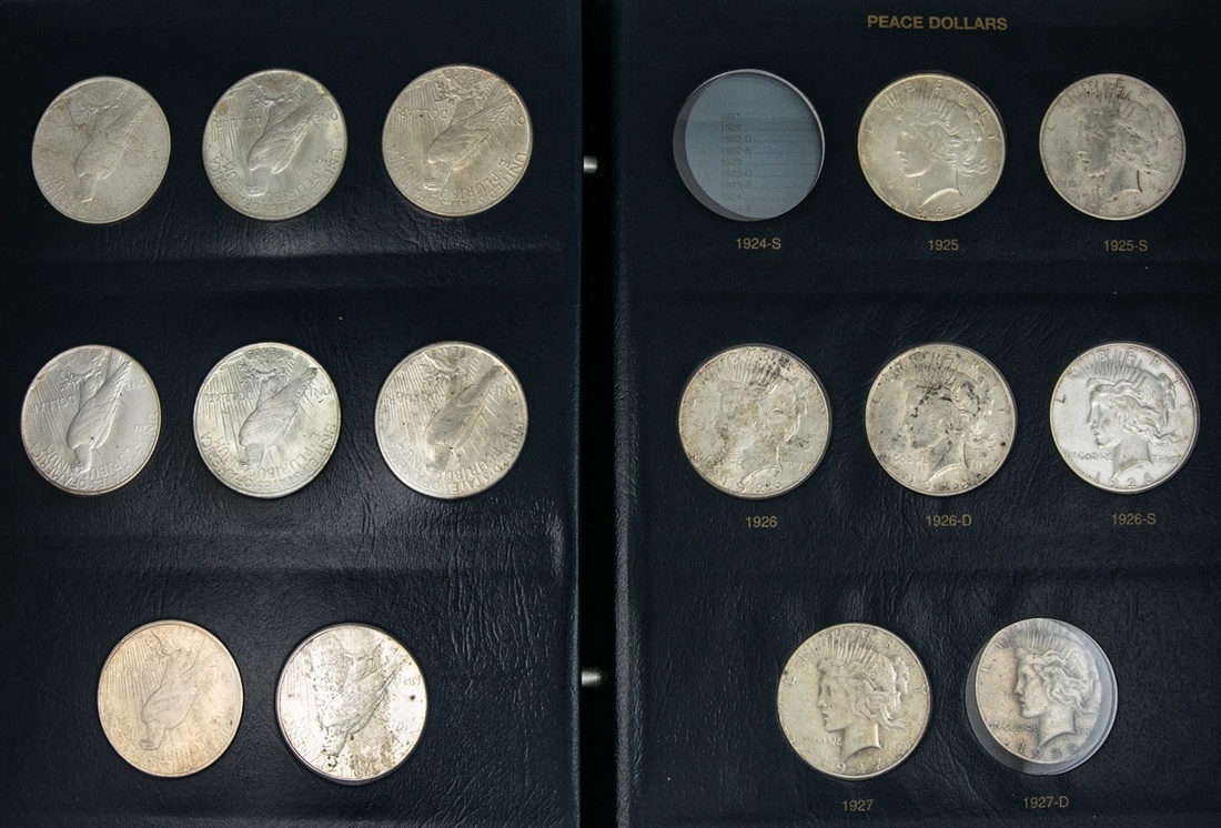 Incomplete Set of Peace Dollars. 1921-1935-S. Missing 1924-S, 1927-D, 1927-S, 1928, 1934, 1934-S and 1935. The 1921 AU, the 1927, 1934-D and 1935-S are About VF. Housed in Whitman album. About VF-BU. (17)