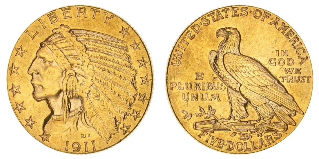 1911 $5 Indian. AU.