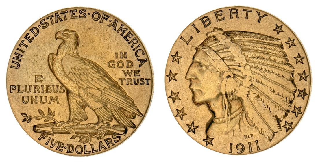 1911 $5 Indian. Very Fine.