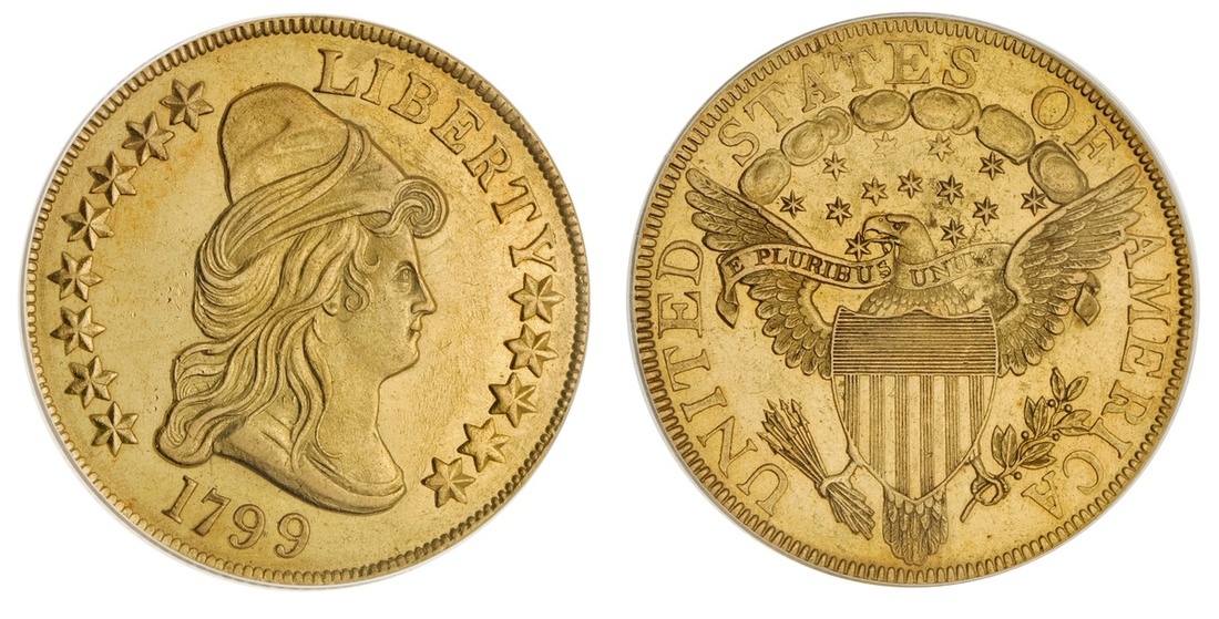 1799 $10 Draped Bust Heraldic Eagle Reverse, Large Stars Obverse. ANACS AU 55. Good lustre and sharp details, an attractive early US Eagle that could be graded a tad higher despite some obverse chatter.