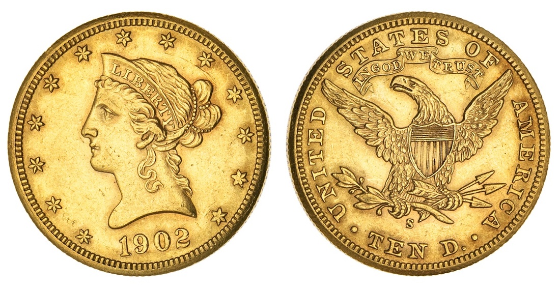 1902-S $10 Liberty. EF-AU. Light stacking marks.