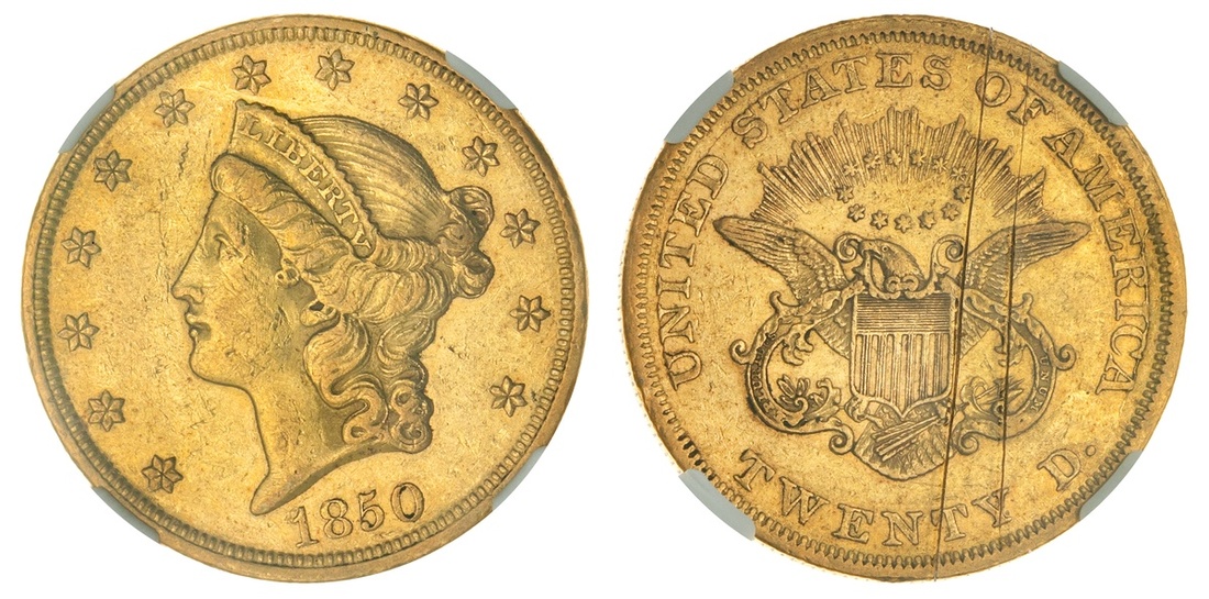 1850 $20 Liberty, No Motto. NGC AU 55.