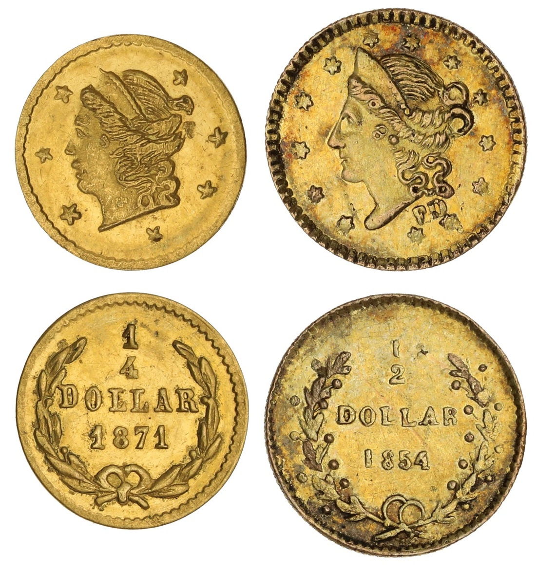 1854 FD Private California Gold ½ Dollar, 13 Stars. Round. KM 11.6. Very scarce. EF-AU, also 1871. 1/4 Dollar, 1871. Round. KM 5.1. Uncirculated. (2)