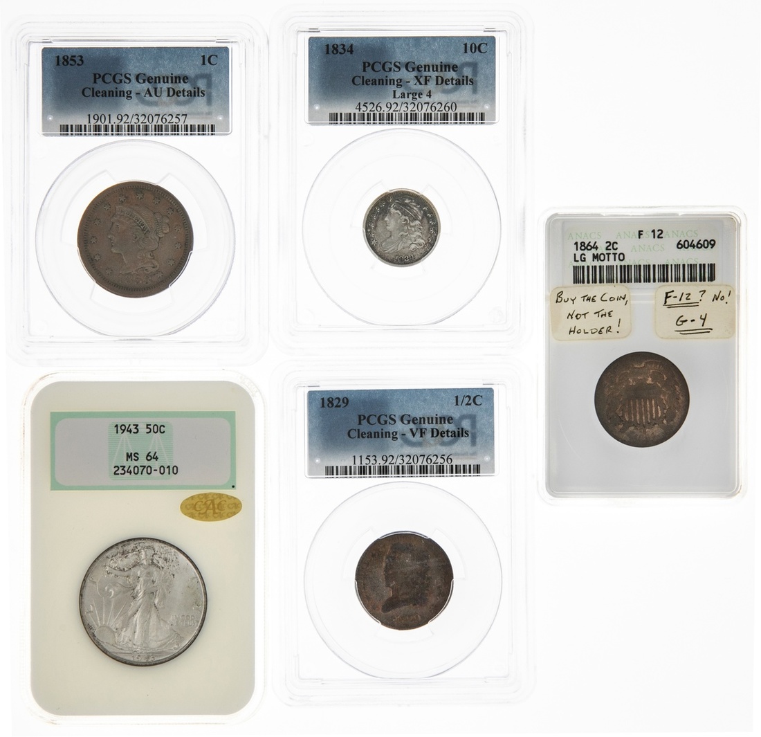 Quintet of encapsulated Type Coins. 1834 Capped bust Dime, large 4, PCGS Genuine Cleaning - XF Details; 1829 Classic head Half Cent, 1829, PCGS Genuine Cleaning - VF Details; 1853 Large Cent, PCGS Genuine Cleaning - AU Details; 1865 2 Cents. large motto, ANACS F 12; and 1943 Walking Liberty Half Dollar, NGC MS 64 (green label) with CAC. (5)