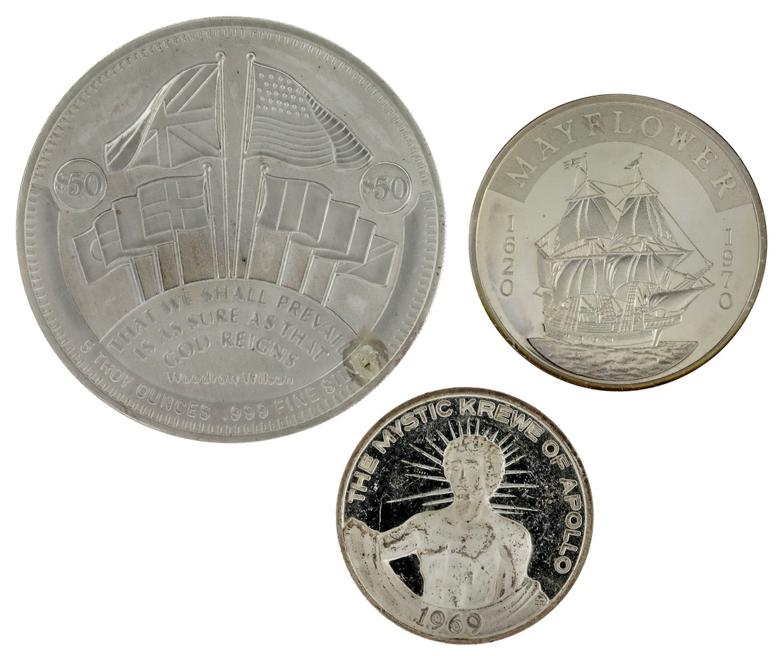 Trio of modern US Silver Medals. America's Liberty Fleet, 1913-1988. 5 troy ounces, .999 silver; 350th Anniversary of the Mayflower, 1620-1970. 45mm, 43.9 gms; and carnival medal - The Mystic Krewe of Apollo, 1969/Descent into Hades, 1971. 38mm, 22.85 gms. (3)