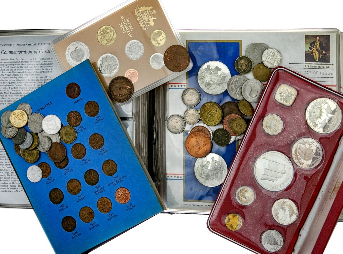 Postmasters of America - Medallic First Date Covers, 1975 Set. Franklin Mint. 48 different Sterling Silver Medals, ca. 38mm set in First Day Cover cachets in a custom album. Brilliant Proof strikes; also Australian Proof Sets, 1989, 1991; Bahamas 9-piece Proof Set, 1974; a Singapore Mint Set; Whitman Canadian sparsely-filled Quarter album with 11 silver quarters, a partially filled 1920- Small Cent album; and a small group of modern world minors.