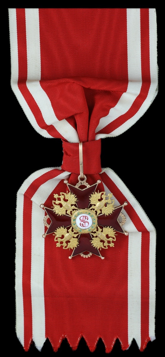 Russia, Imperial, Order of St. Stanislas, Civil Division, Nicholas II, Grand Cross set of Insignia, by Keibel, St. Petersburg, sash Badge, gold and enamel, with full Sash for wear; Star, silver, silver-gilt and enamel, maker's name to reverse and on retaining pin, nearly extremely fine