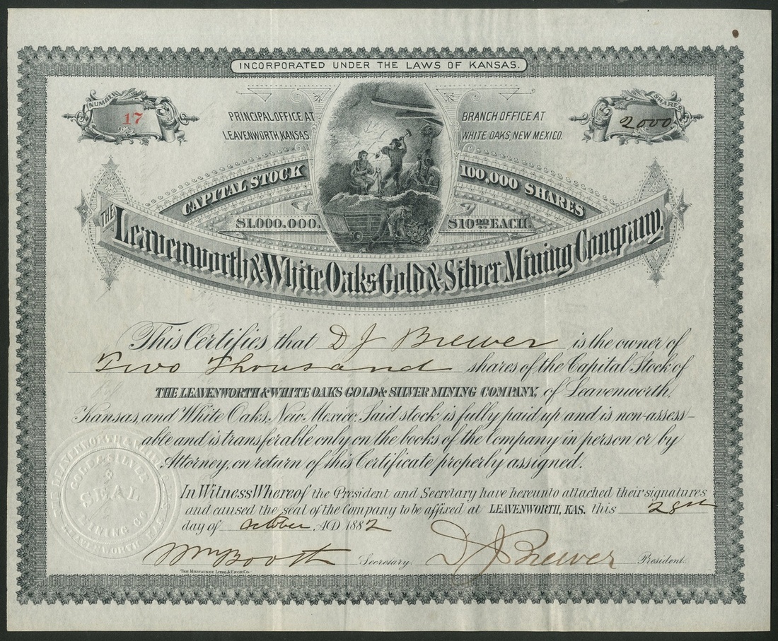 Leavenworth & White Oaks Gold & Silver Mining Company, $10 shares, Leavenworth 188[2], #17, miners top centre, black, Milwaukee Litho & Engr. Co. Owned the Badger Boy, Silver Glance and other mines in White Oaks, New Mexico. GVF.