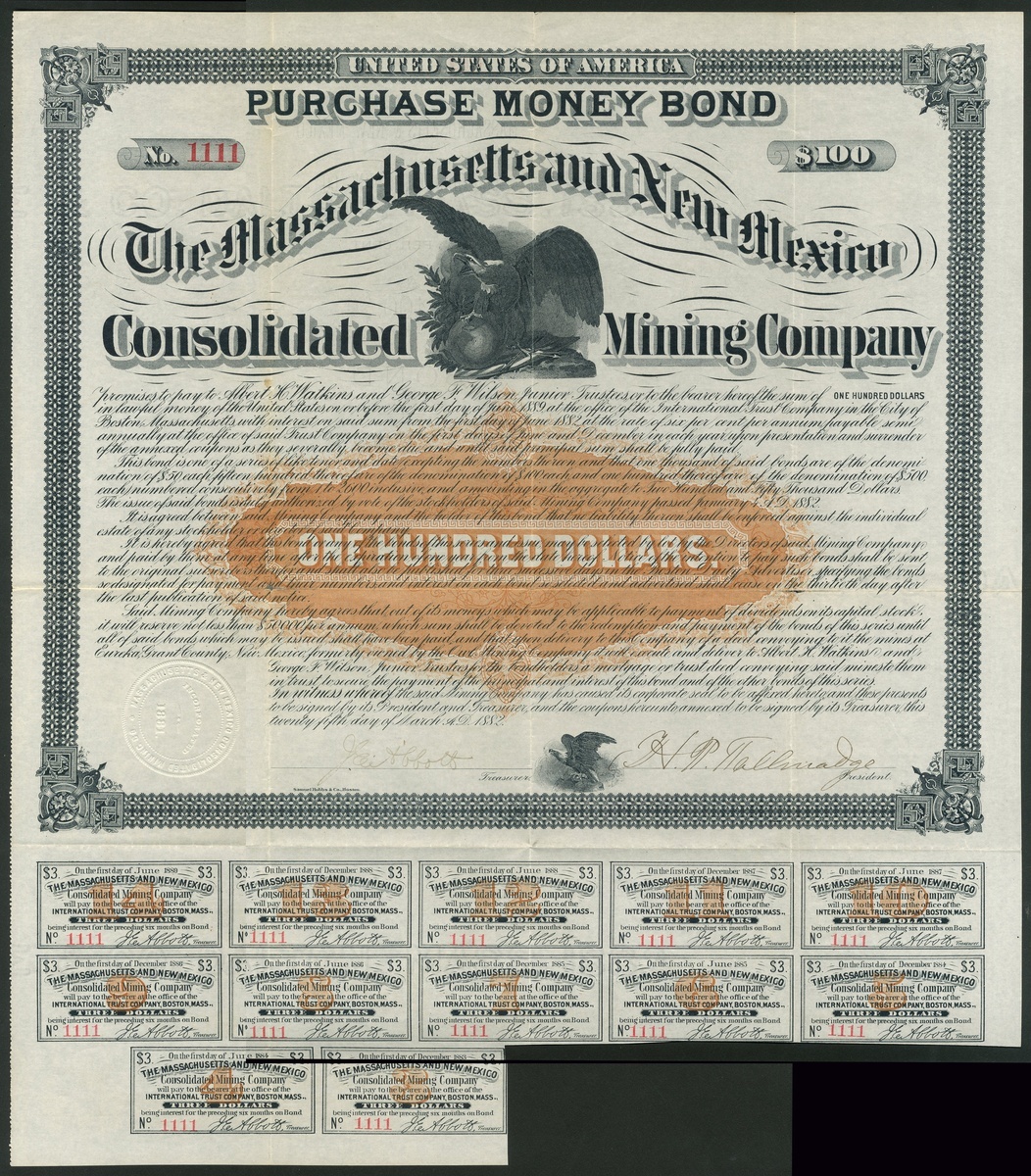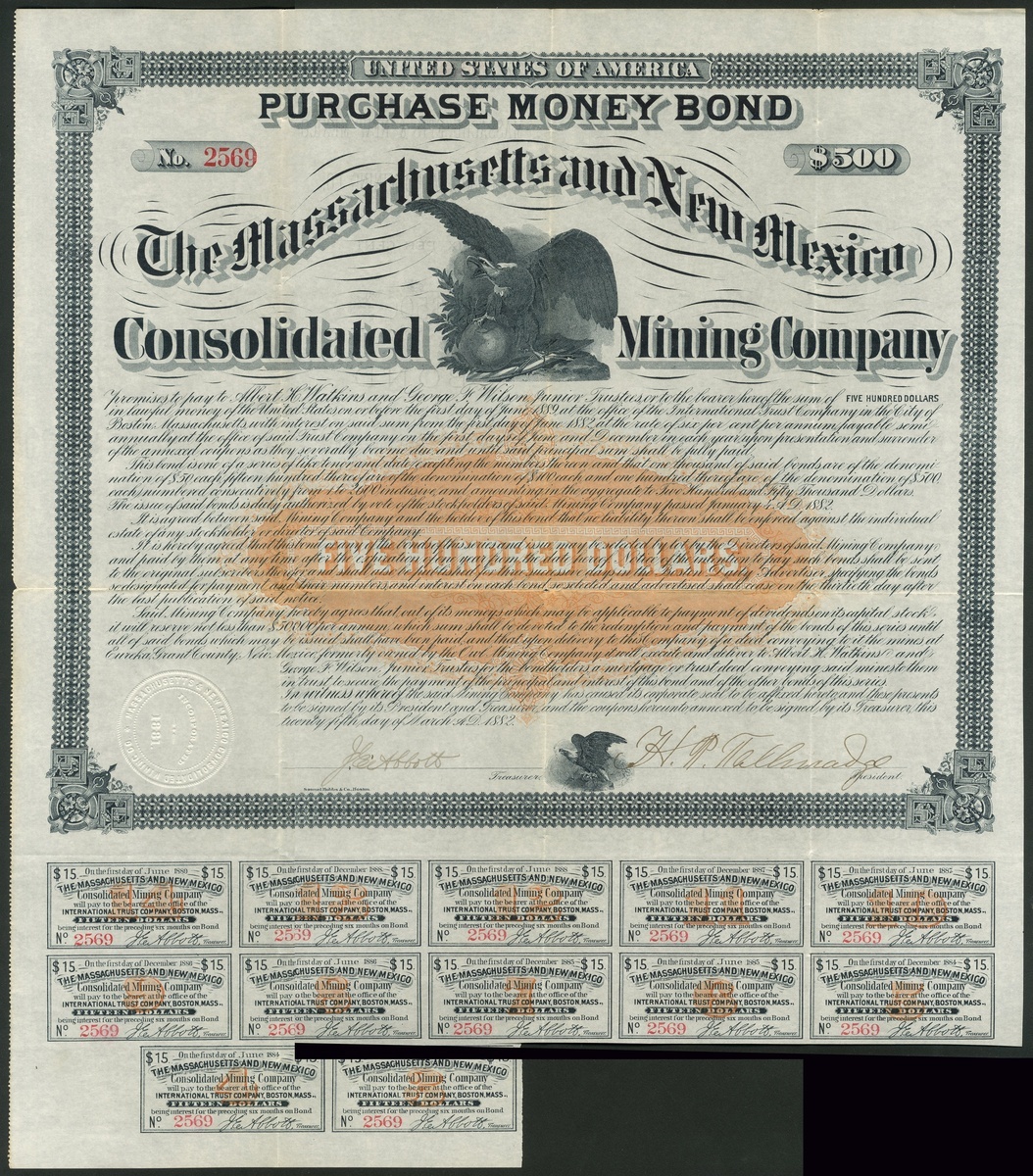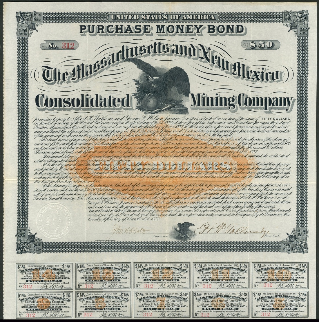 Massachusetts and New Mexico Consolidated Mining Co., Purchase Money bond for $50, #312, $100, #1111 and $500, #2569, 1882, ONLY 100 of the $500 ISSUED; together with other certificates of the company (7), 1870's and 80's, and Massachusetts and New Mexico Mining Co., 18[79], 2 examples, and, Plymouth Rock Mining Co., $25 shares, 18[80], 3 examples. All but the first two bonds are cancelled. Mines at Silver City, The Plymouth Rock merged with the Massachusetts and New Mexico Mining Co., to form the Massachusetts and New Mexico Consolidated Mining Co. Generally VF or better (15).