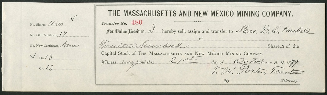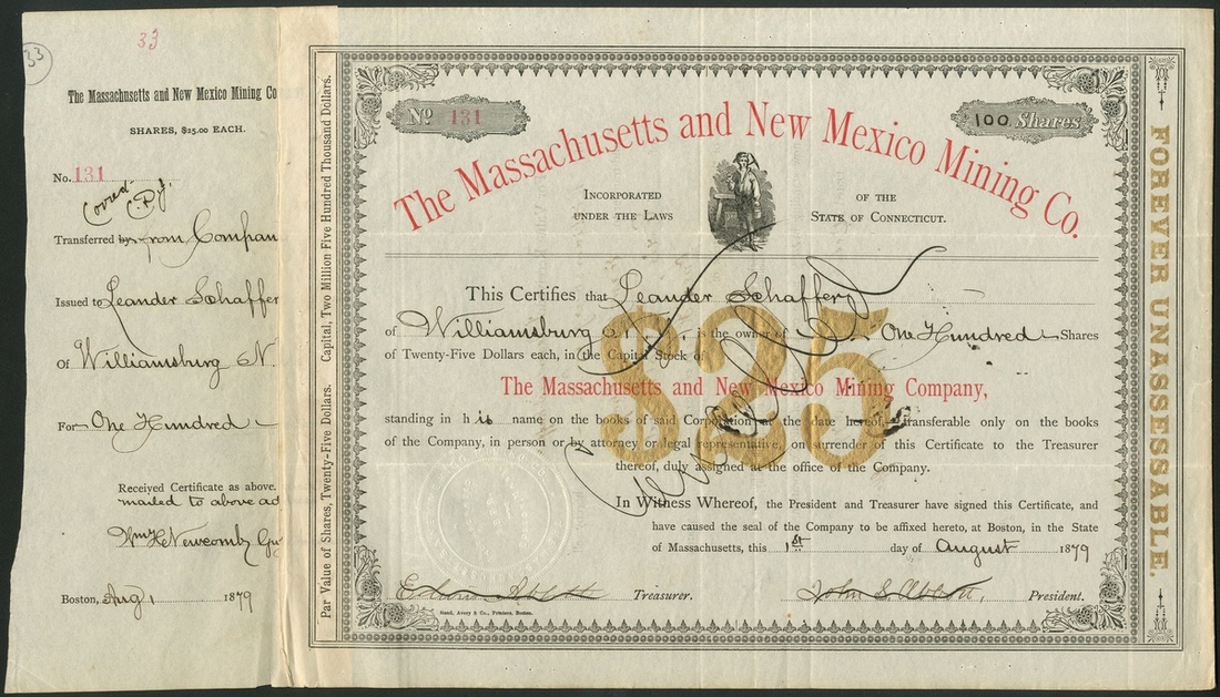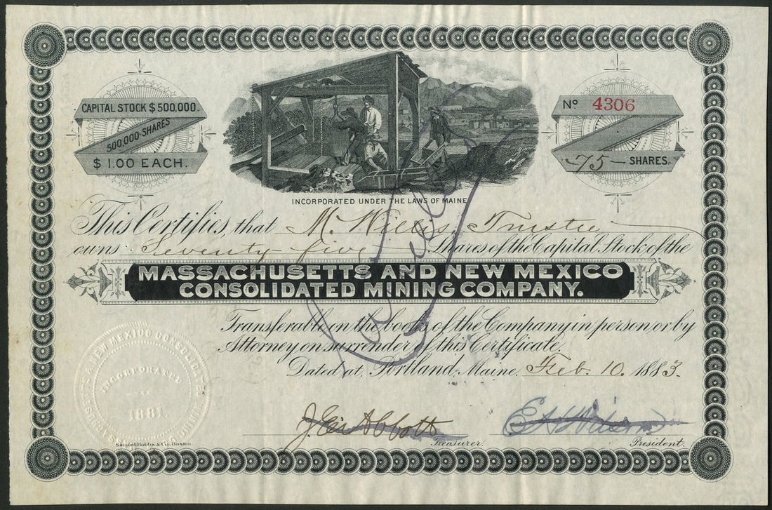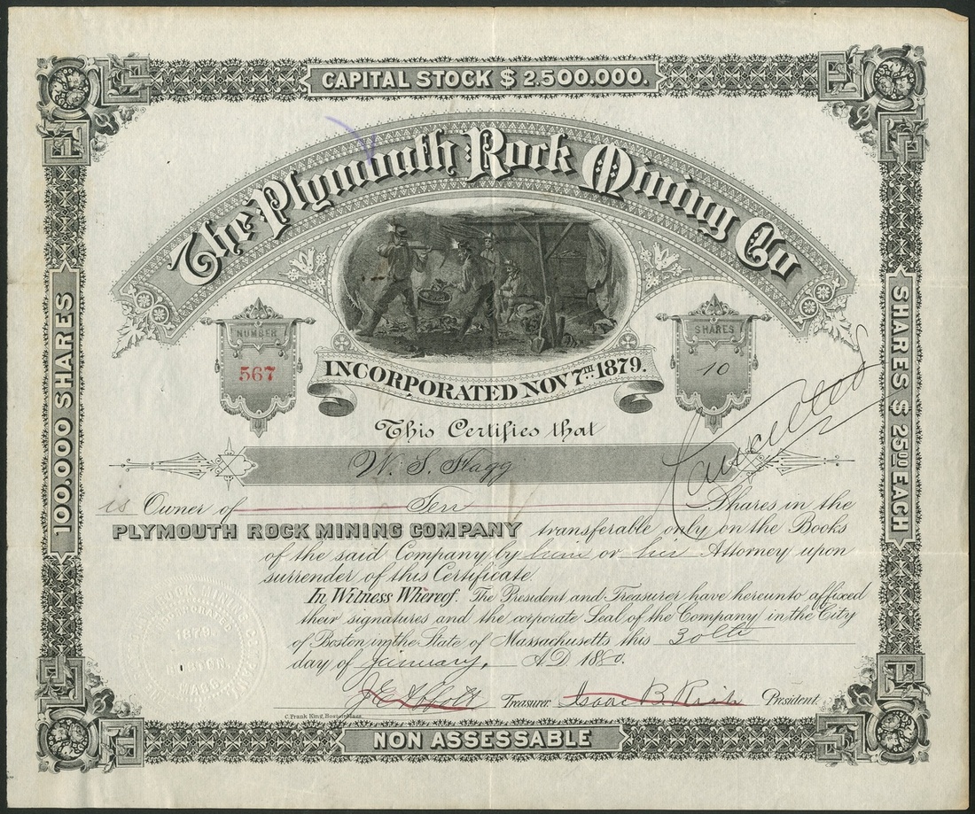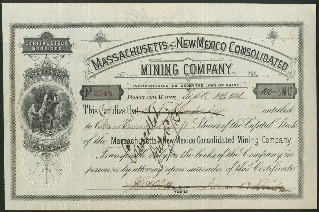 Massachusetts and New Mexico Consolidated Mining Co., Purchase Money bond for $50, #312, $100, #1111 and $500, #2569, 1882, ONLY 100 of the $500 ISSUED; together with other certificates of the company (7), 1870's and 80's, and Massachusetts and New Mexico Mining Co., 18[79], 2 examples, and, Plymouth Rock Mining Co., $25 shares, 18[80], 3 examples. All but the first two bonds are cancelled. Mines at Silver City, The Plymouth Rock merged with the Massachusetts and New Mexico Mining Co., to form the Massachusetts and New Mexico Consolidated Mining Co. Generally VF or better (15).