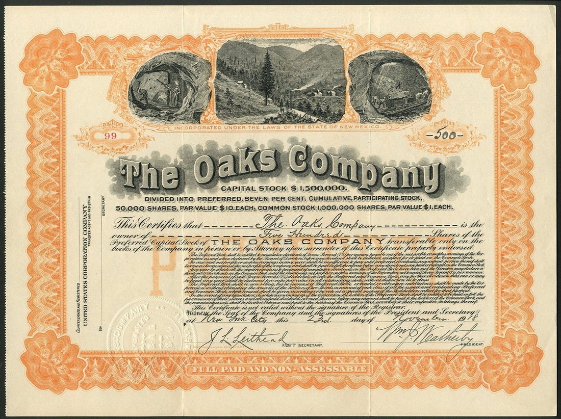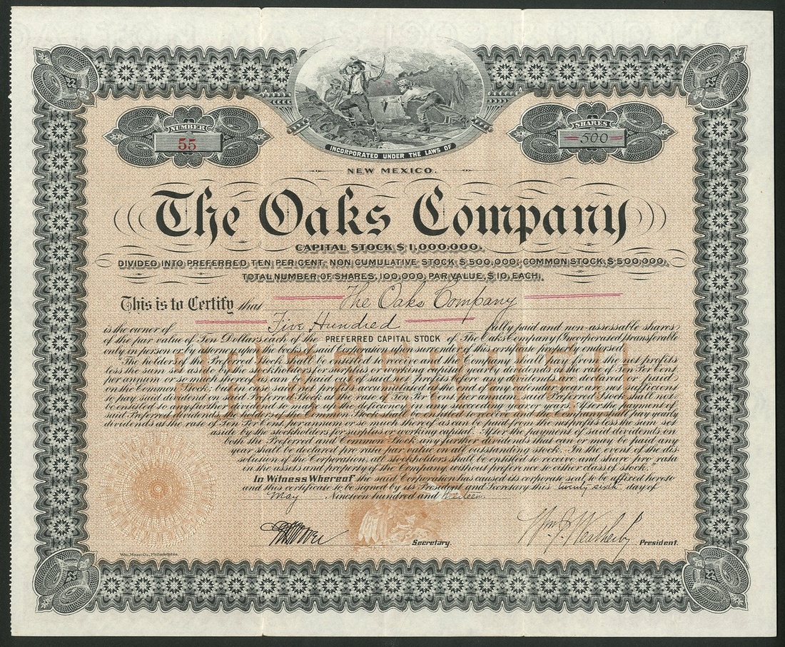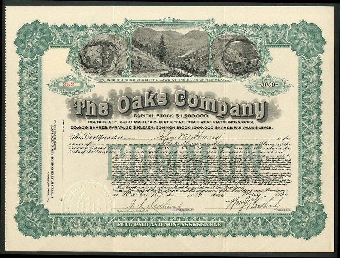 Oaks Company, trio of certificates; common stock, 19[20], #352, mine site and tunnel works at top, green and black; preferred stock, 19[18], #99, as before but orange, and preferred capital stock, 19[13], #55, mine workers at top, ornate border, black with brown underprint. Acquired leases on various mining operations in Alma, New Mexico. All GVF. (3)