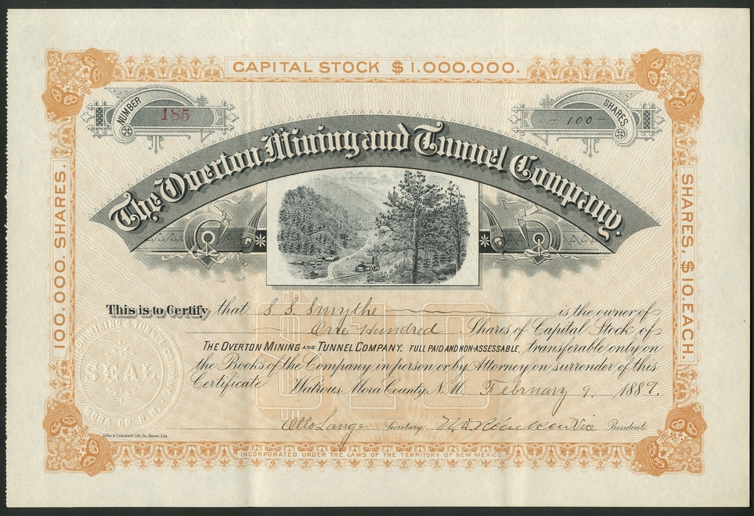 Overton Mining and Tunnel Company, $10 shares, Watrous, Mora County 188[9], #185, mine buildings in wooded valley, orange brown and black. Commenced operations at Watrous, New Mexico in 1881AF.