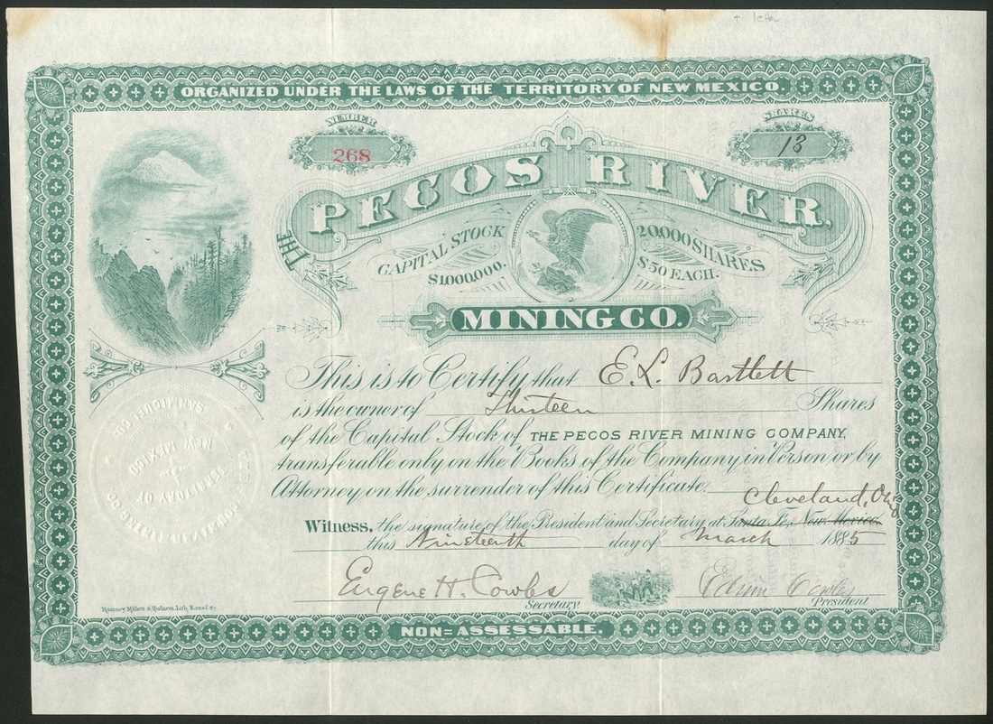 Pecos River Mining Company, $50 shares, Santa Fe (overwritten Cleveland, Ohio) 188[5], #268, mountain view at left, green. Mines at Terrero, New Mexico. Small stain at top margin otherwise VF.