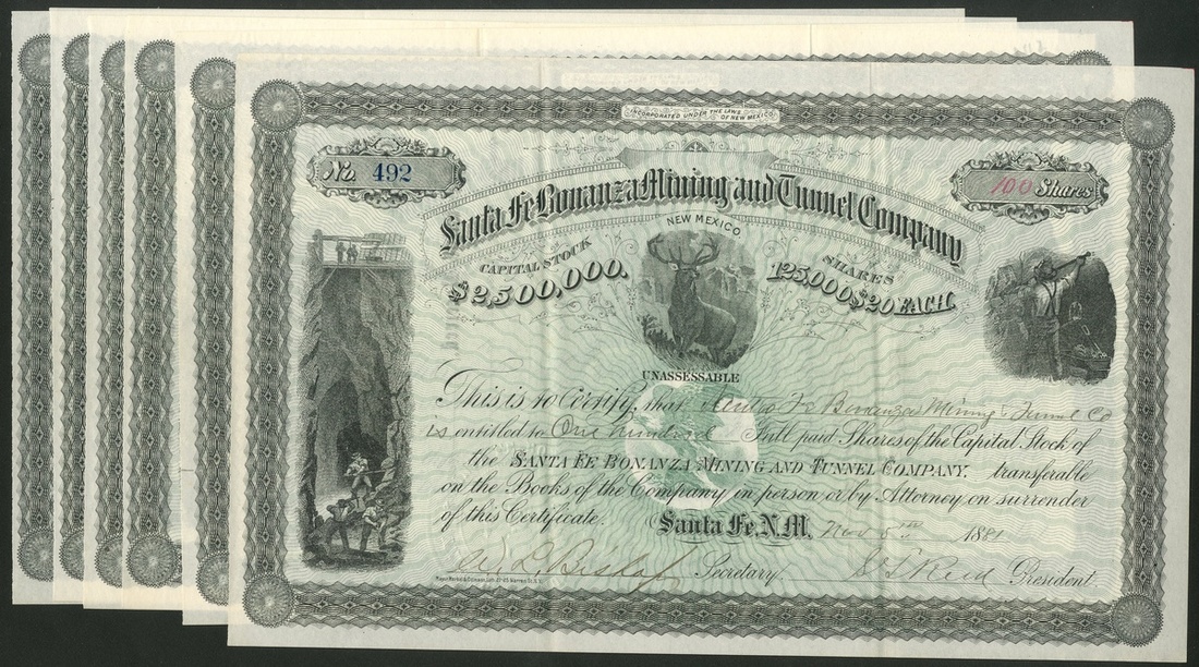 Santa Fe Bonanza Mining and Tunnel Company, a nice investment group of 6 certificates for $20 shares, Santa Fe 18[81], #491, #492 and #589 to #592, attractive pieces with miners in shaft at left, at rock face at right, black with blue underprint. Trifolded, GVF (6 examples).
