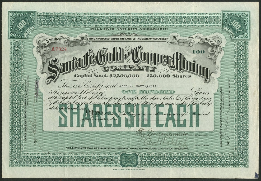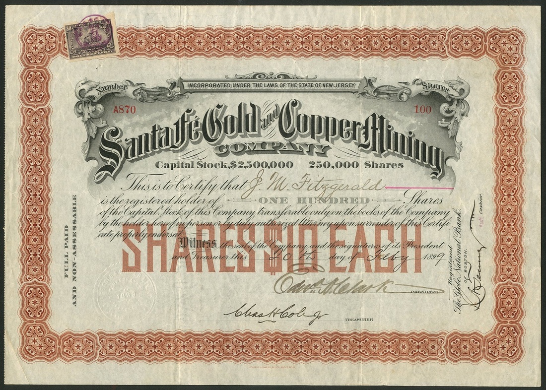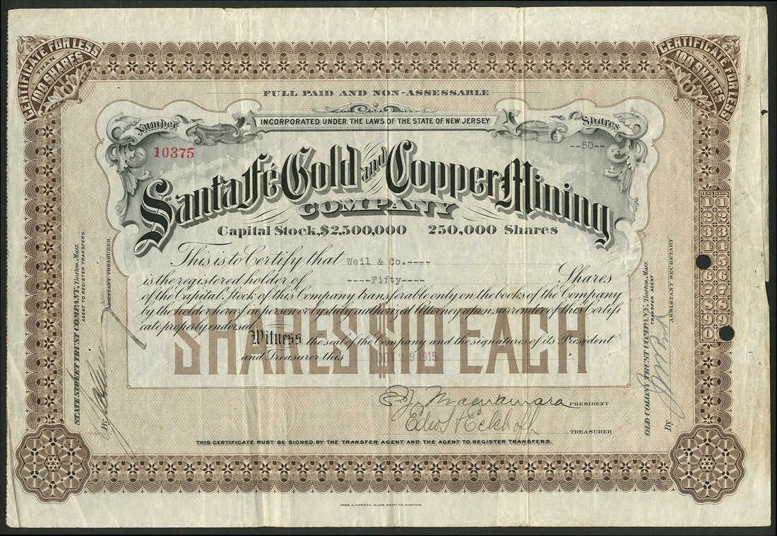 Santa Fe Gold and Copper Mining Company (NJ), 100 shares of $10, 189[9], #A870, brown and black; 100 shares of $10, [1916], A7824, green and black, and, less than 100 shares of $10, [1915], #10375, brown and black. VF (3).