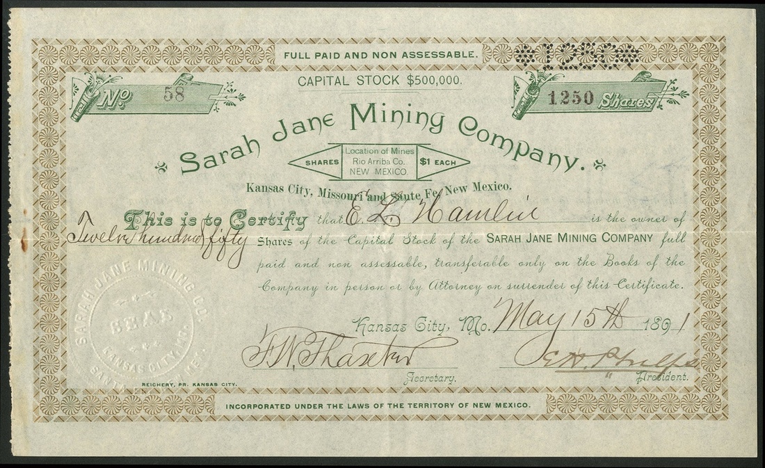 Sarah Jane Mining Company, $1 shares, Kansas City, MO 189[1], #58, green and gold, Reichert, Pr. Kansas City. Mines in Rio Arriba County, New Mexico. Rust mark in left margin, VF.