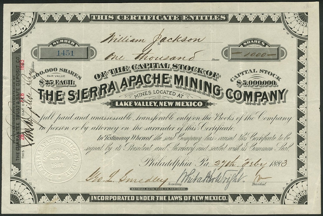 Sierra Apache Mining Company, $25 shares, Philadelphia 188[2], #1451, with facsimile signature of J. Whitaker Wright as President, black, Kendall Bank Note Co., Mines at Lake Valley, New Mexico. Whitaker Wright was a company promoter based in Philadelphia whjo made a fortune in Leadville, Colorado and Lake Valley, New Mexico. He returned to England where he carried on the same business floating many company for mining in Western Australia, British Columbia and elsewhere. He was found guilty of fraud following the collapse of his empire and committed suicide in an ante room of the court. GVF.