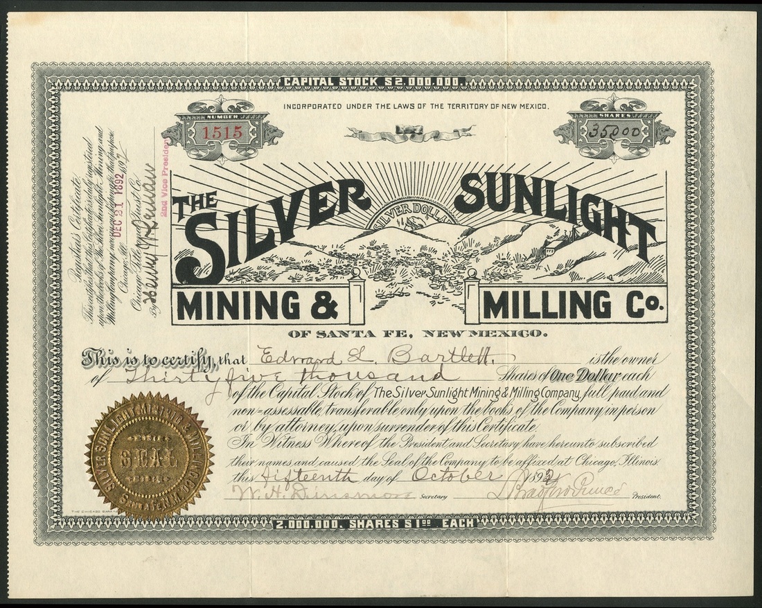 Silver Sunlight Mining & Milling Co., $1 shares, Chicago 189[2], #1515, silver dollar and coin covered hills, black, gold seal. This piece for 35,000 shares. Owned 4 mines and a concentrating mill alongside the Kelly Mine, Magdalena District, Socorro County, New MexicoVF.