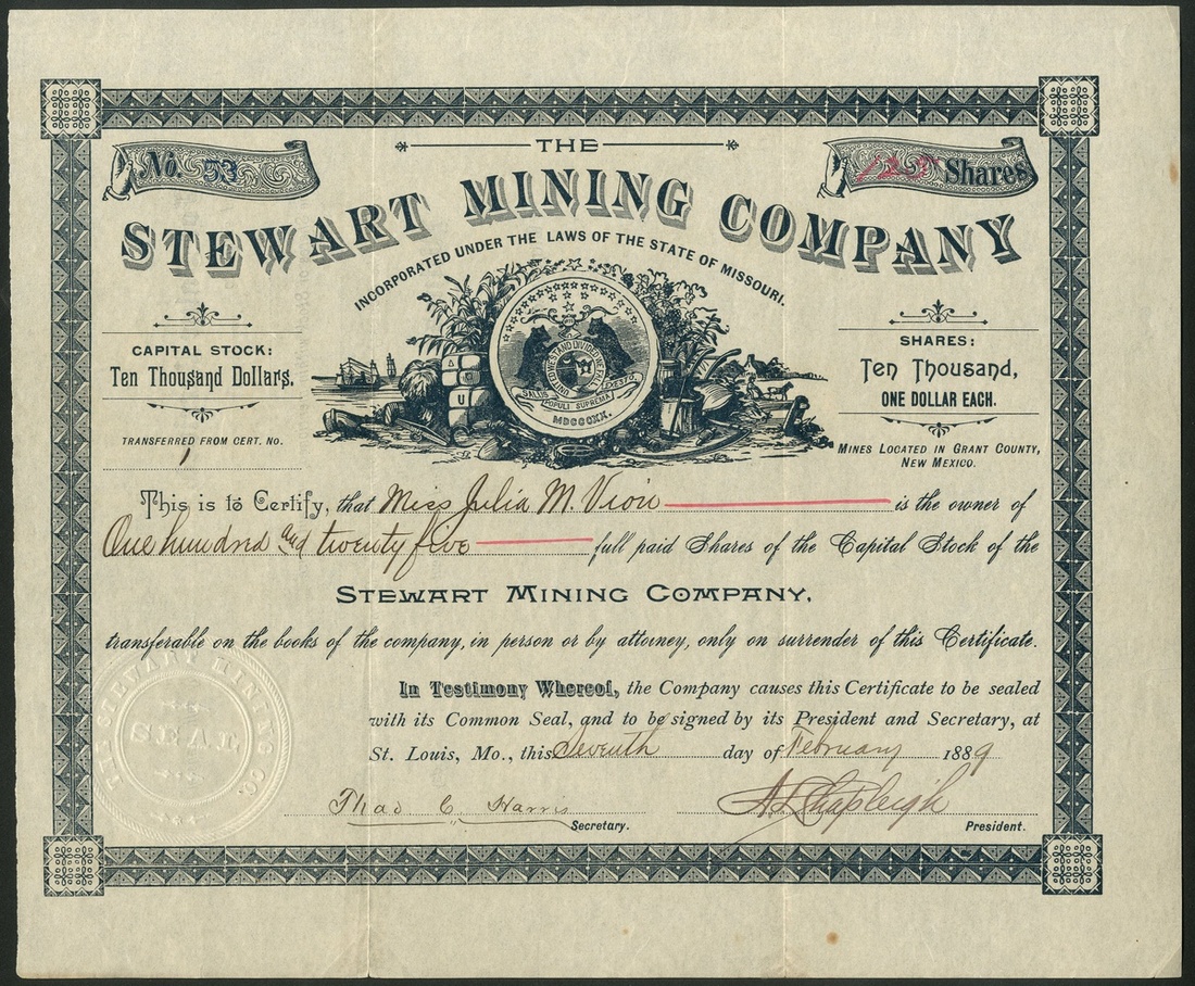 Stewart Mining Company, Missouri, $1 shares, St Louis 188[9], #53, Missouri State seal at top, black. Mines in Grant County, New Mexico. VF.
