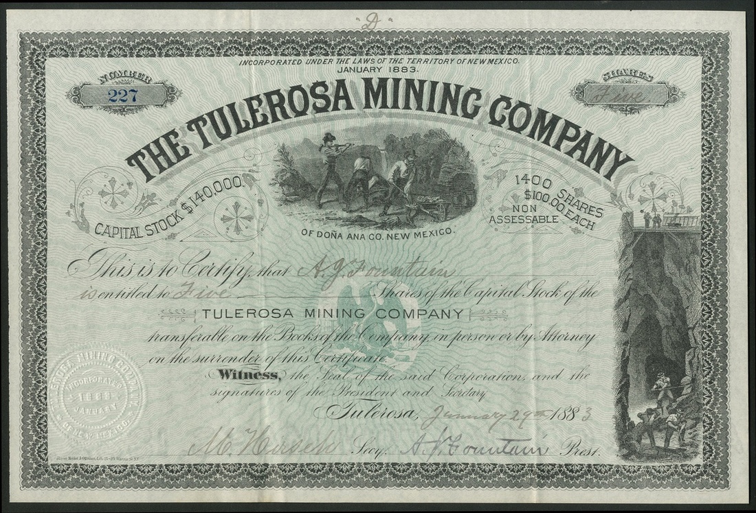 Tulerosa Mining Company, $100 shares, Tulerosa 188[3], #227, miners at work above ground in centre and below ground at right, black, blue underprint, Bayer, Merkel & Ostmann. Dona Ana County, New Mexico. GVF.