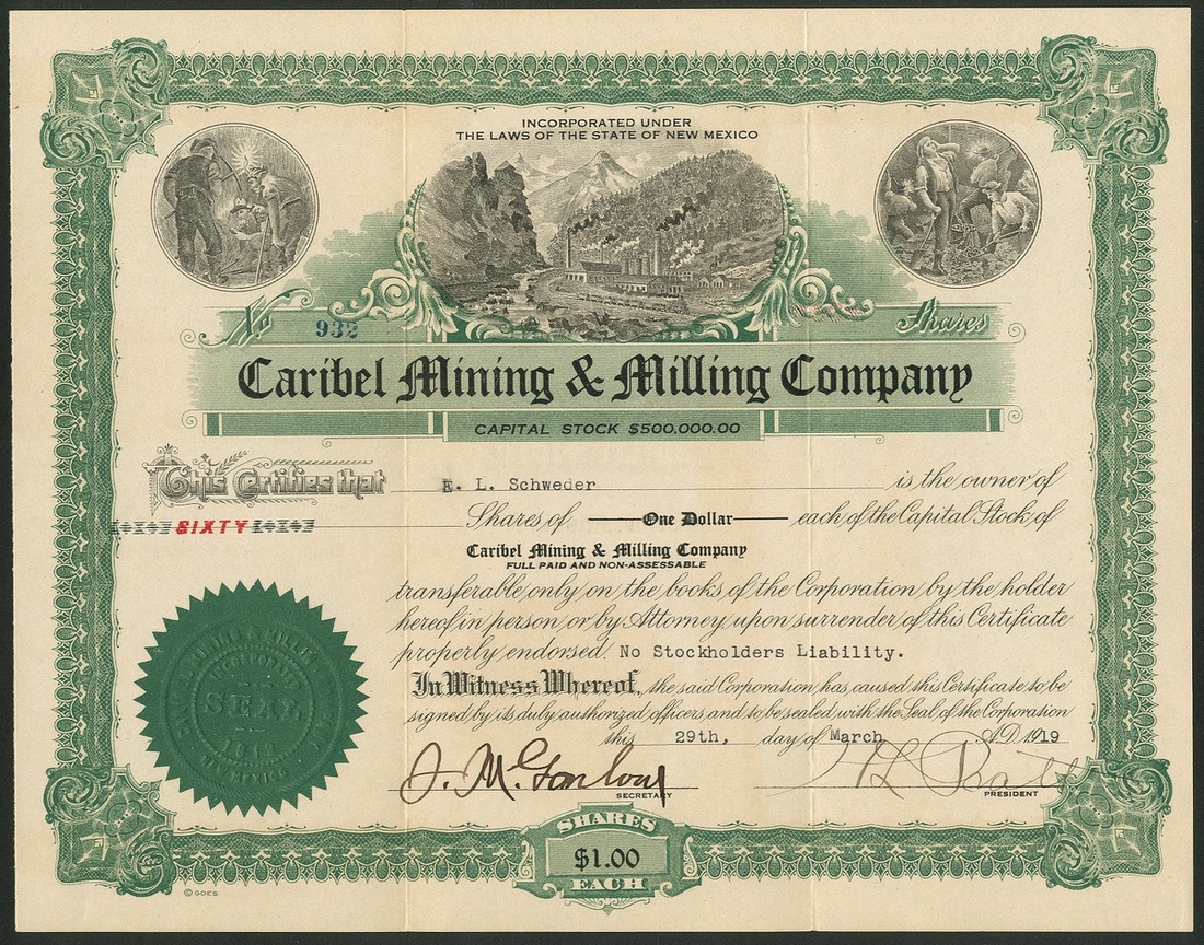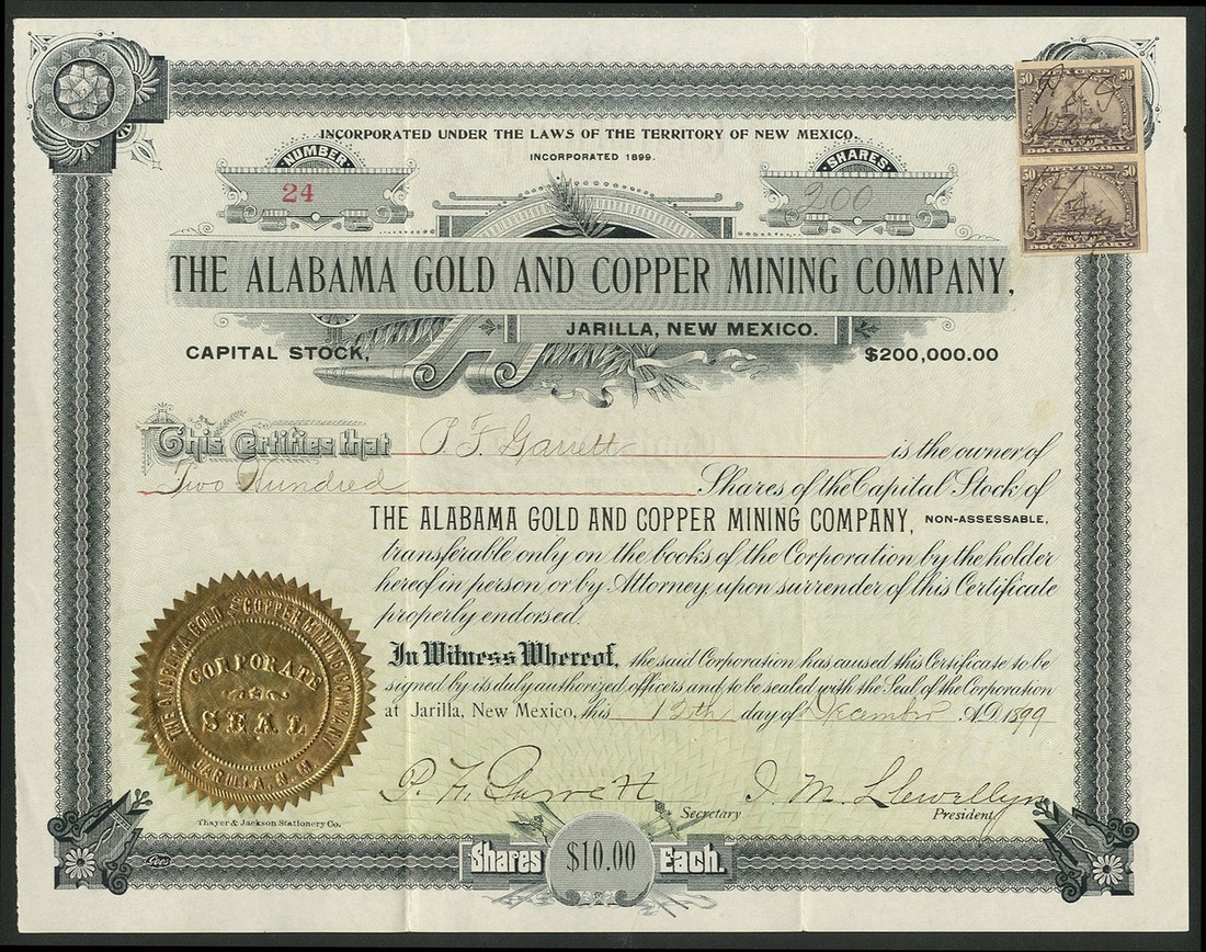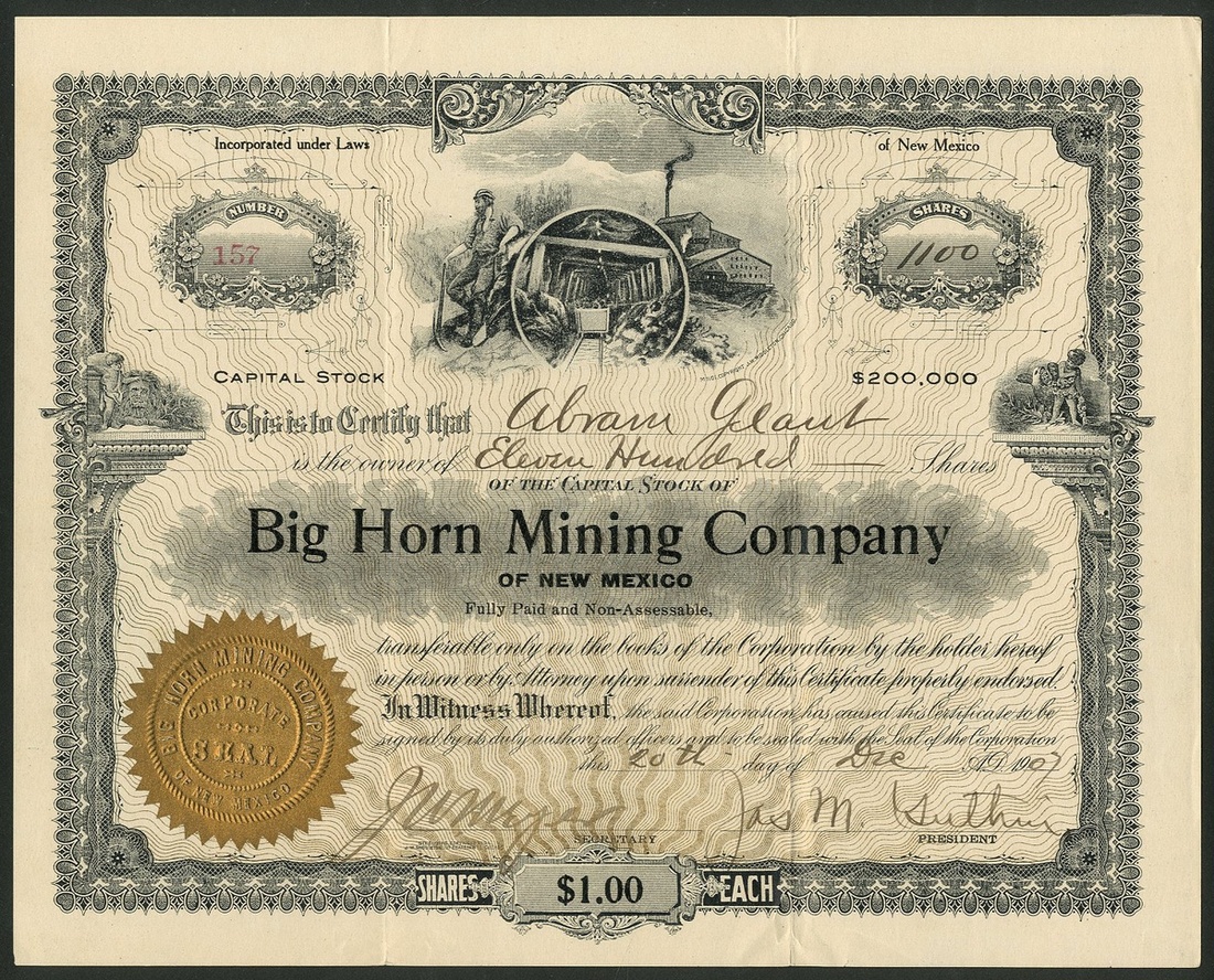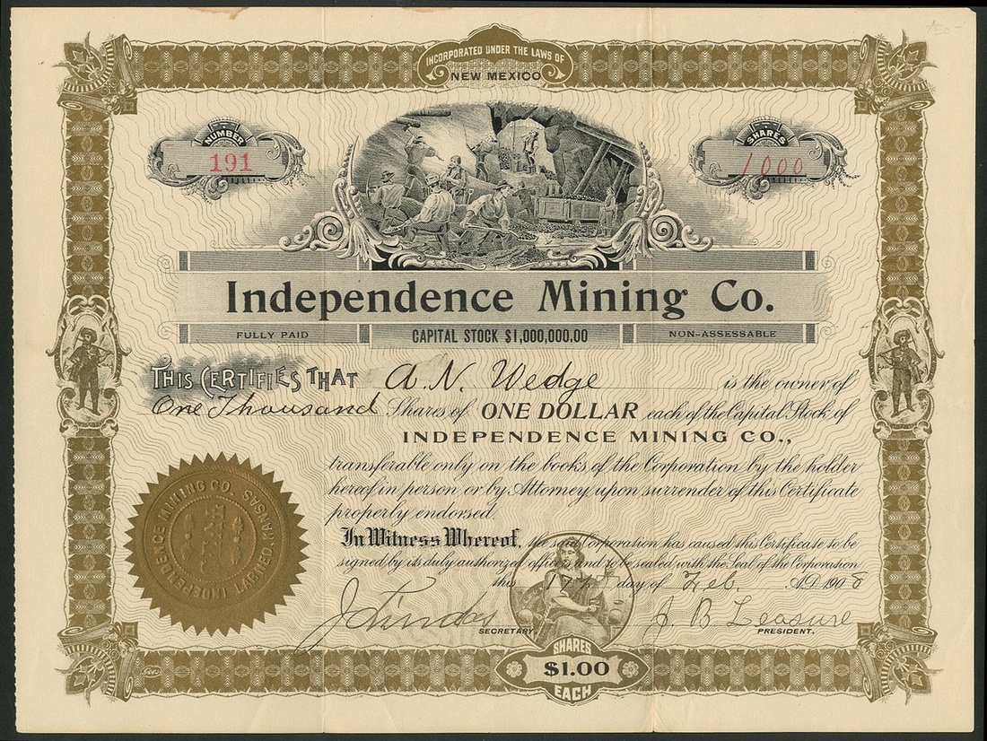 A group of New Mexico mining companies, comprising Big Horn Mining Co., 19[07], #157; Alabama Gold & Copper Mining Co., Jarilla, 1[899], #24; South West Smelting and Refining Co., 190[6], #595; Caribel Mining & Milling Company, 19[19], #932; Copper Canyon Mining Company, 19[18], #46; Tusas Peak Gold & Copper Mining Co., 190[3], #485; Idaho Chemical Gold Mining Company, 189[9], #658, and, Independence Mining Co., 190[8], #191. Generally VF (8).