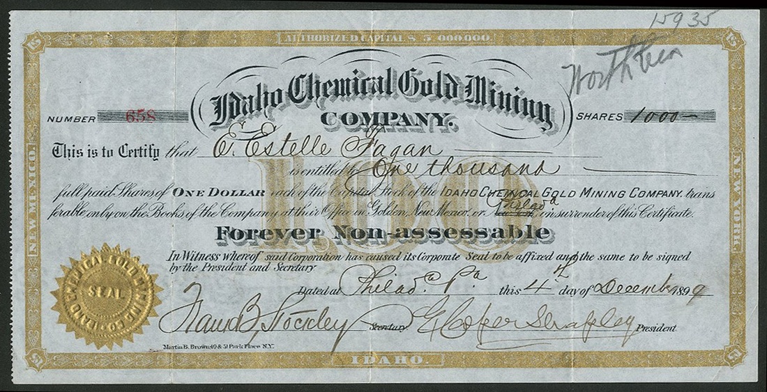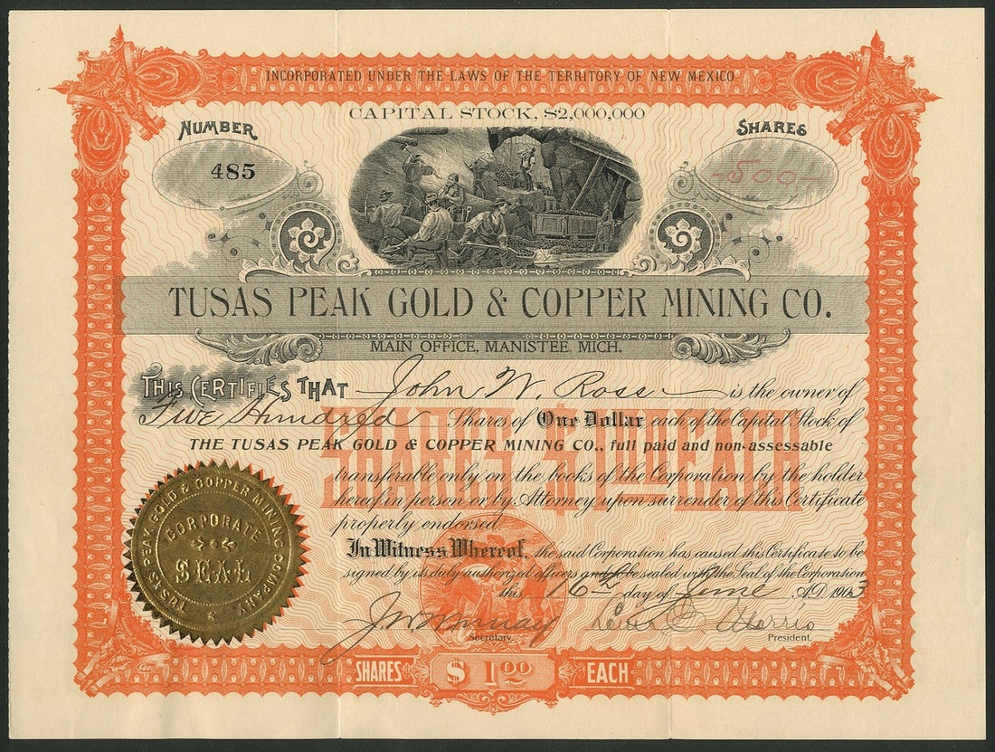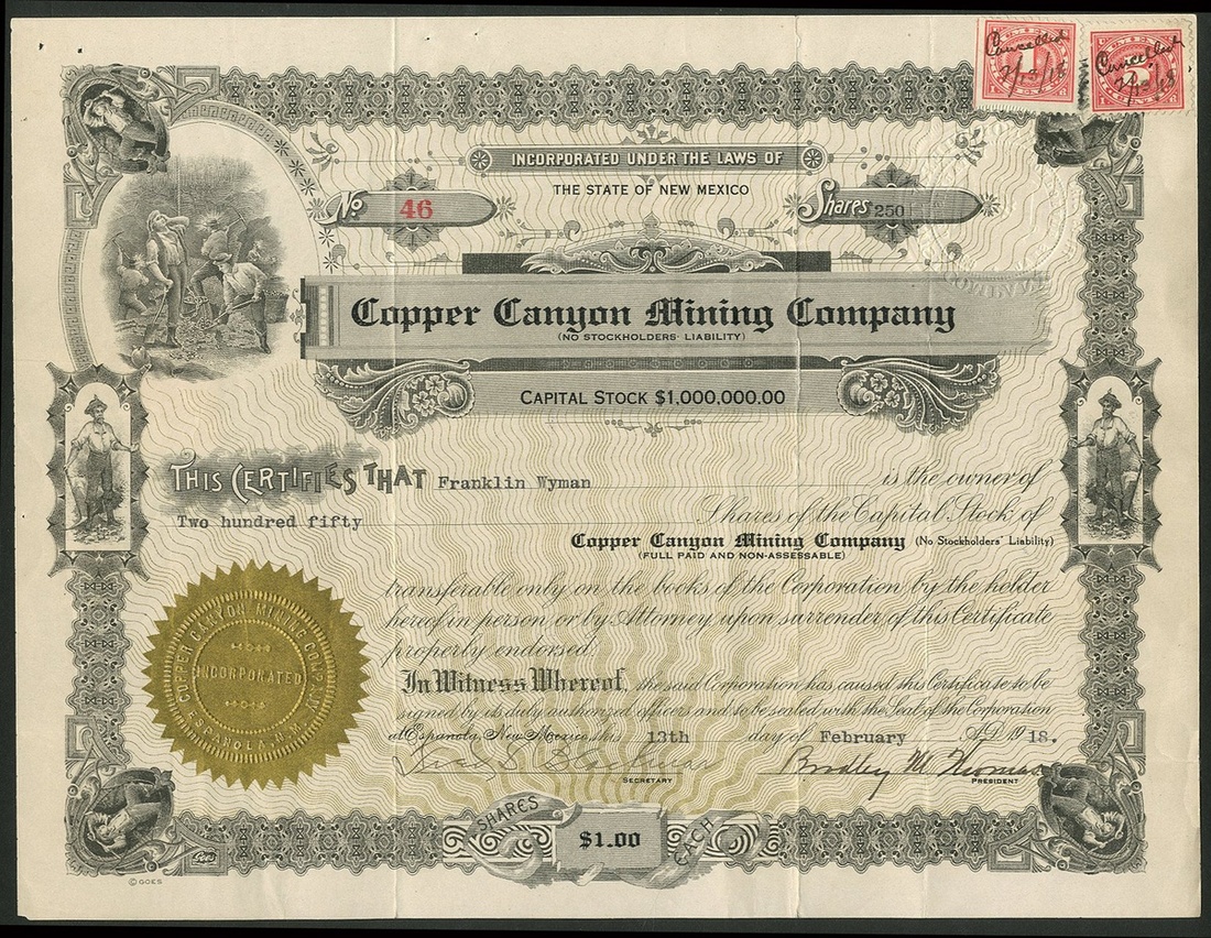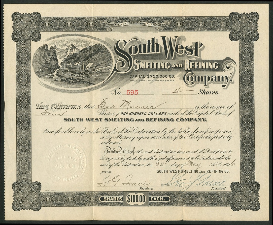 A group of New Mexico mining companies, comprising Big Horn Mining Co., 19[07], #157; Alabama Gold & Copper Mining Co., Jarilla, 1[899], #24; South West Smelting and Refining Co., 190[6], #595; Caribel Mining & Milling Company, 19[19], #932; Copper Canyon Mining Company, 19[18], #46; Tusas Peak Gold & Copper Mining Co., 190[3], #485; Idaho Chemical Gold Mining Company, 189[9], #658, and, Independence Mining Co., 190[8], #191. Generally VF (8).