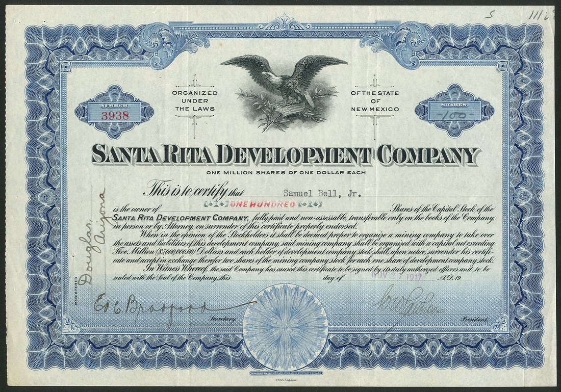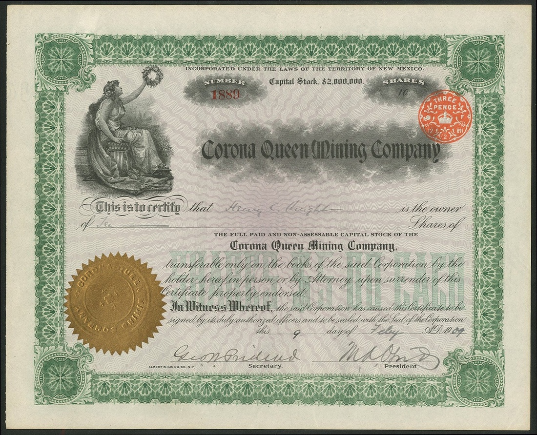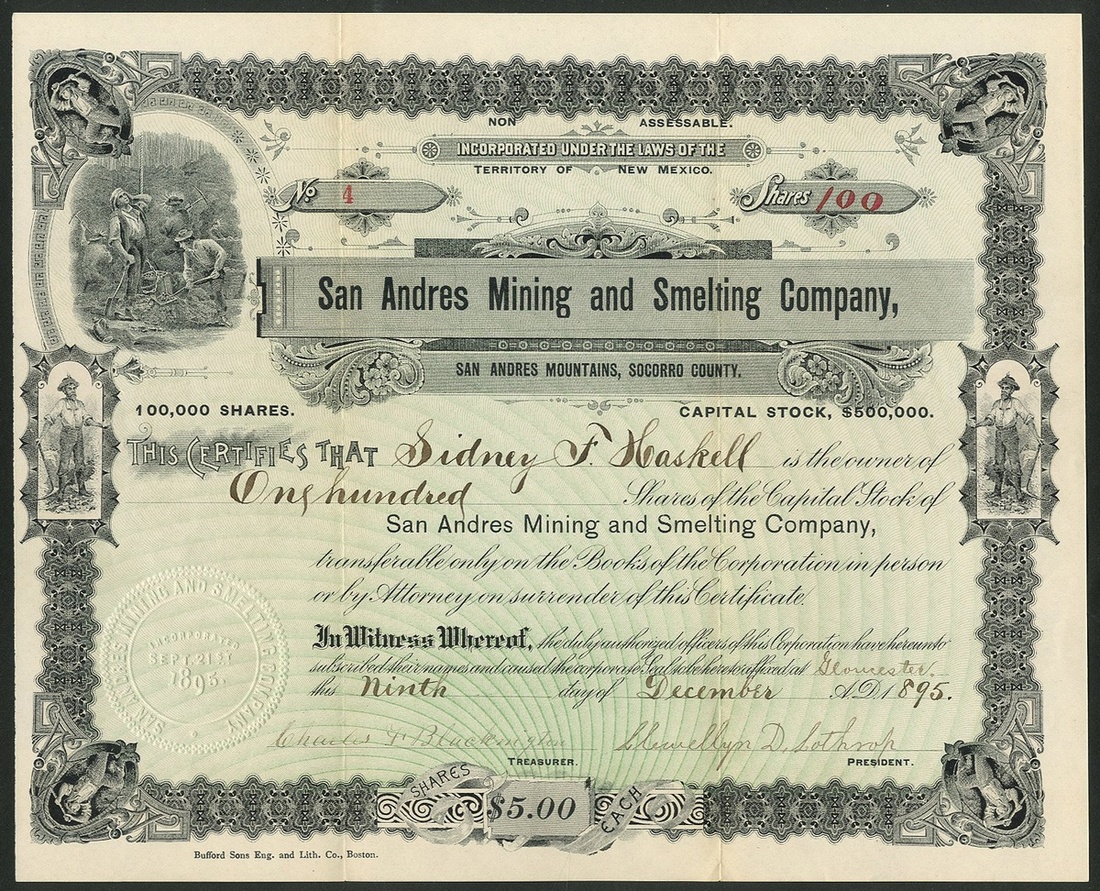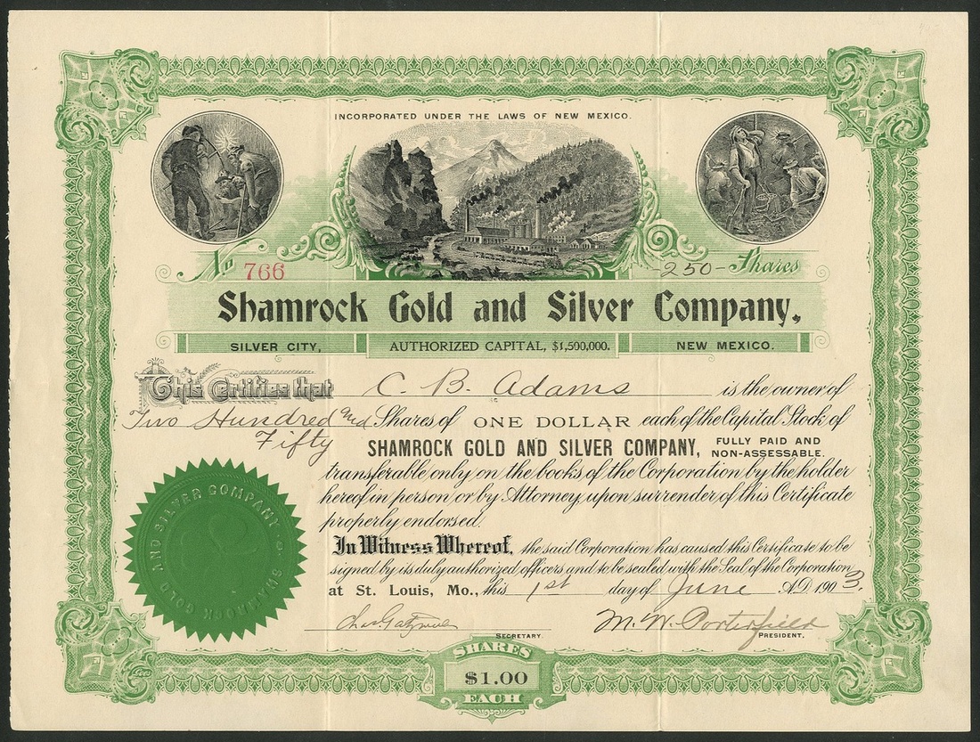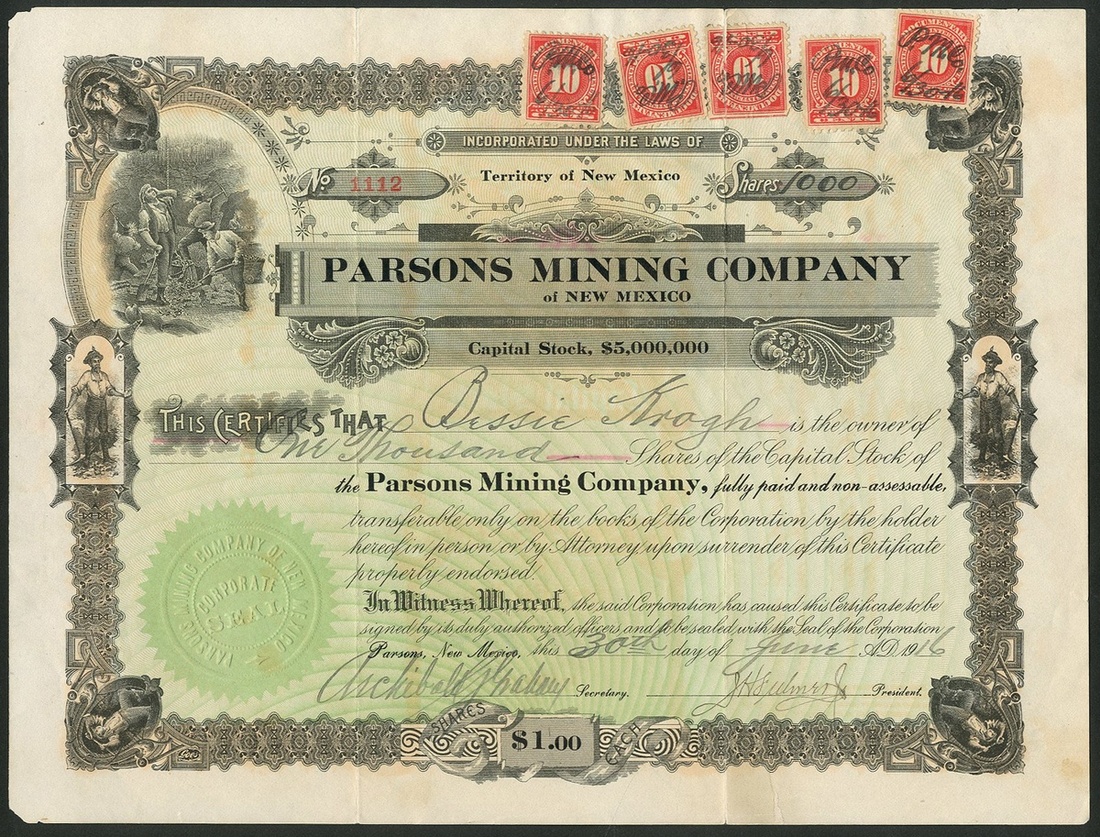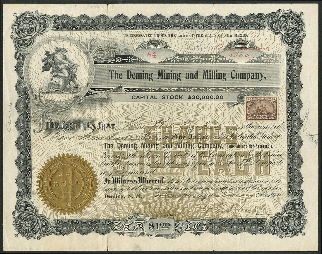 A group of New Mexico mining companies, comprising San Andres Mining and Smelting Co., 1[895], #4; Shamrock Gold and Silver Company, 190[3], #766; Deming Mining and Milling Co., 190[0], #84; Parsons Mining Company, 19[16], 1112; Santa Rita Development Co., 19[17], #3938, and, Corona Queen Mining Company, 19[09], #1889. The third with repaired split at folds, generally VF the first and last EF (6).