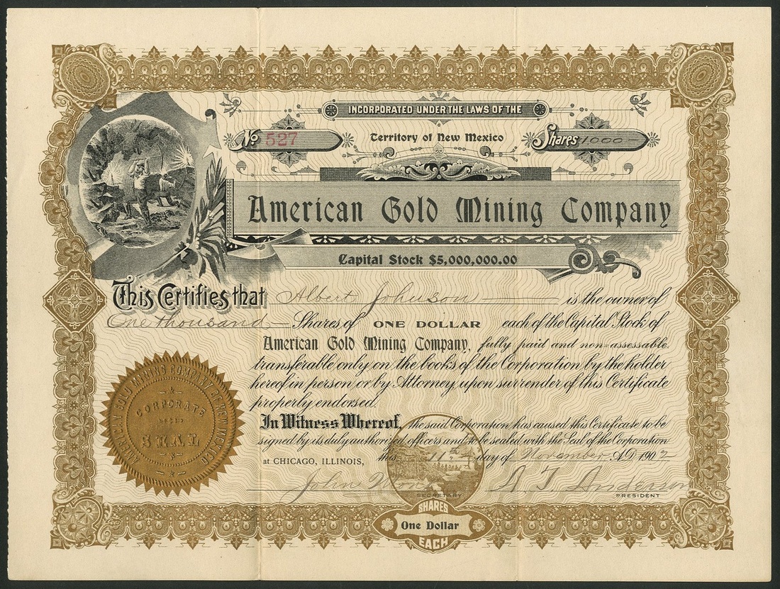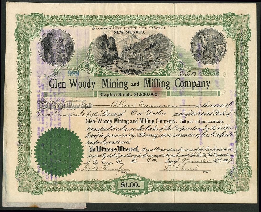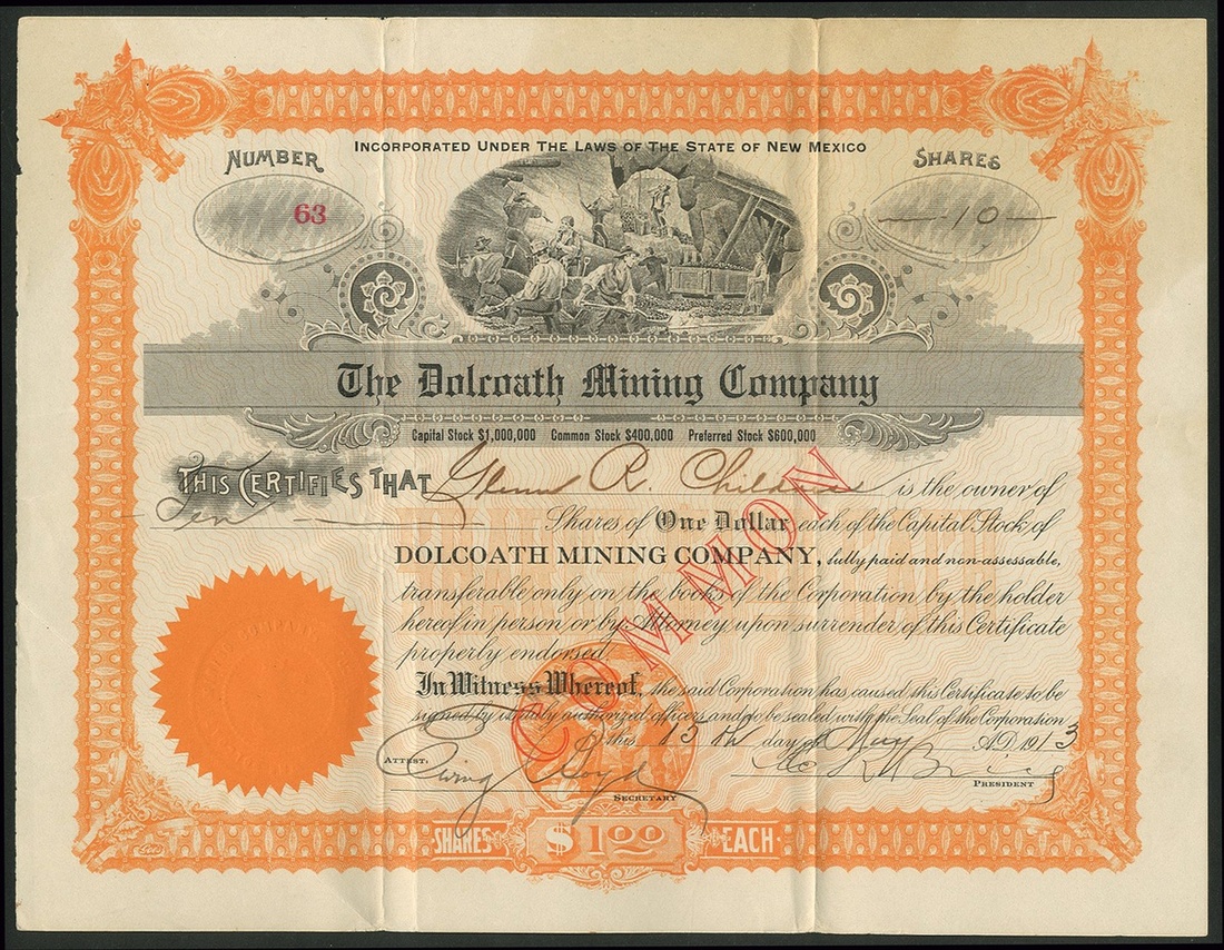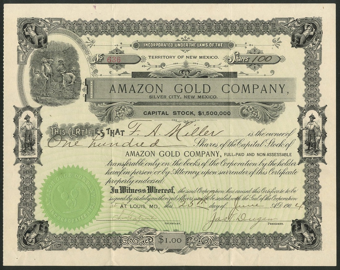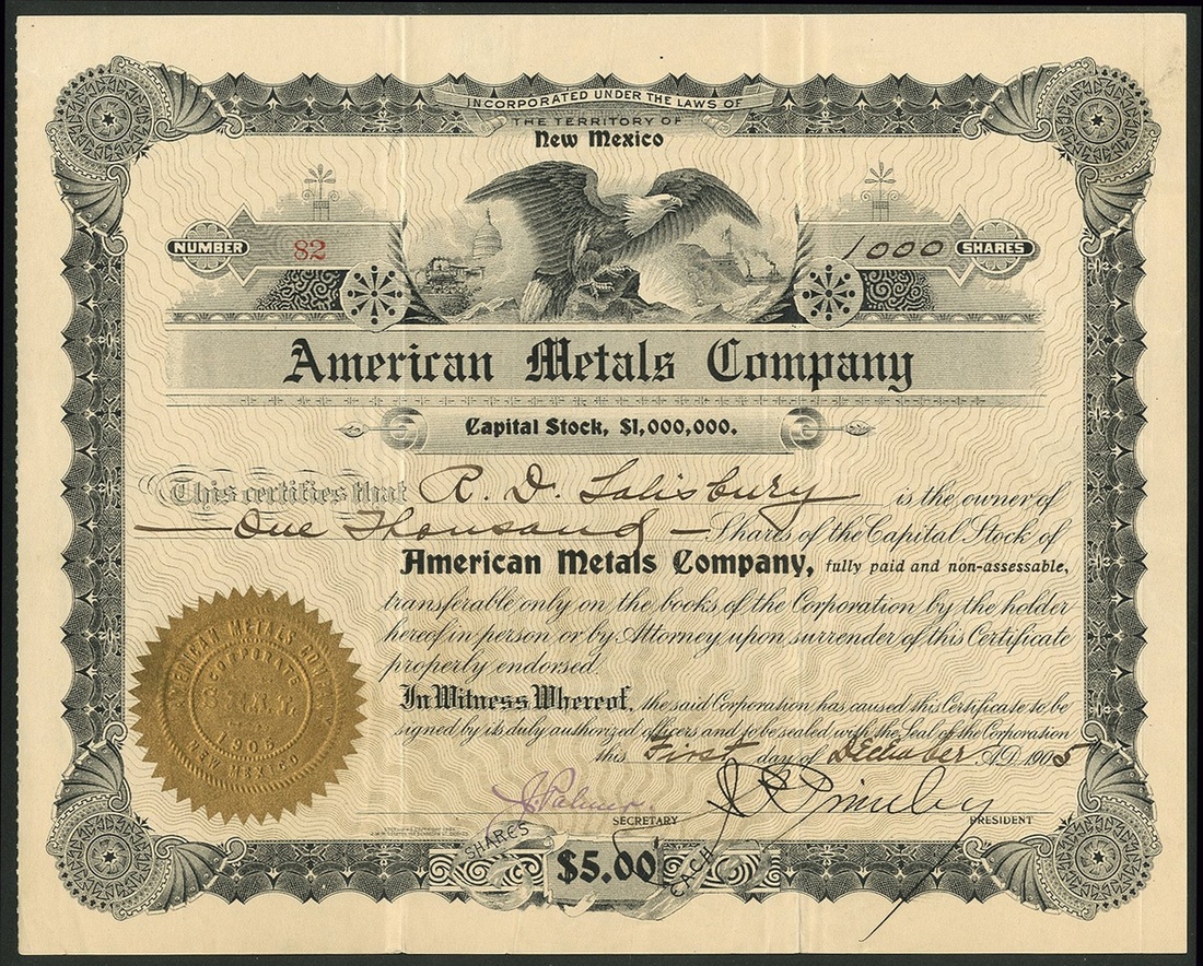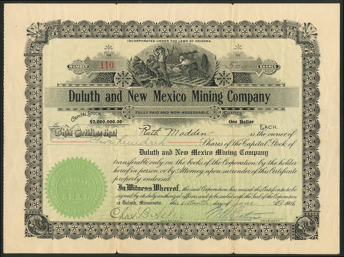 A group of New Mexico mining companies, comprising Amazon Gold Company, Silver City, 190[4], #636; American Gold Mining Company, 190[2], #527; American Metals Company, 190[5], #82; Glen-Woody Mining and Milling Company, 190[4], #989; Duluth and New Mexico Mining Company, 190[6], #110, and, Dolcoath Mining Company, 19[13], #63. Generally VF but the Glen-Woody is a little stained (6).