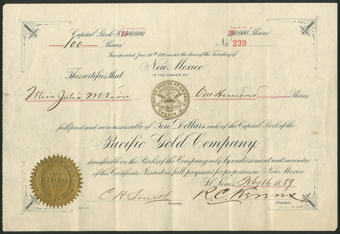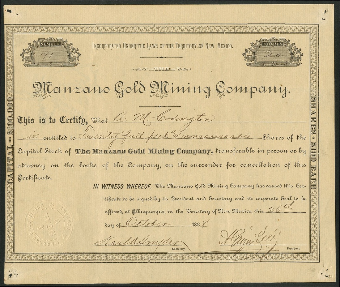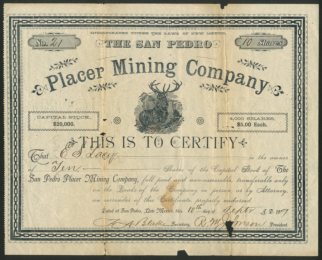 Collection of New Mexico Gold mining companies, comprising Mammoth Consolidated Mining Milling and smelting Co., 1881, black; Manzano Gold Mining Co., 1888, black on buff; Pacific Gold Co., 1889, Mountain Key Mining Co., 1887; Treasury Mountain Mining Co., 1885; San Pedro Placer Mining Co., 189-, and New Mexican Mining and Milling Co., 1884. Several with heavy creasing and some discolouration, most only F - VF (7).