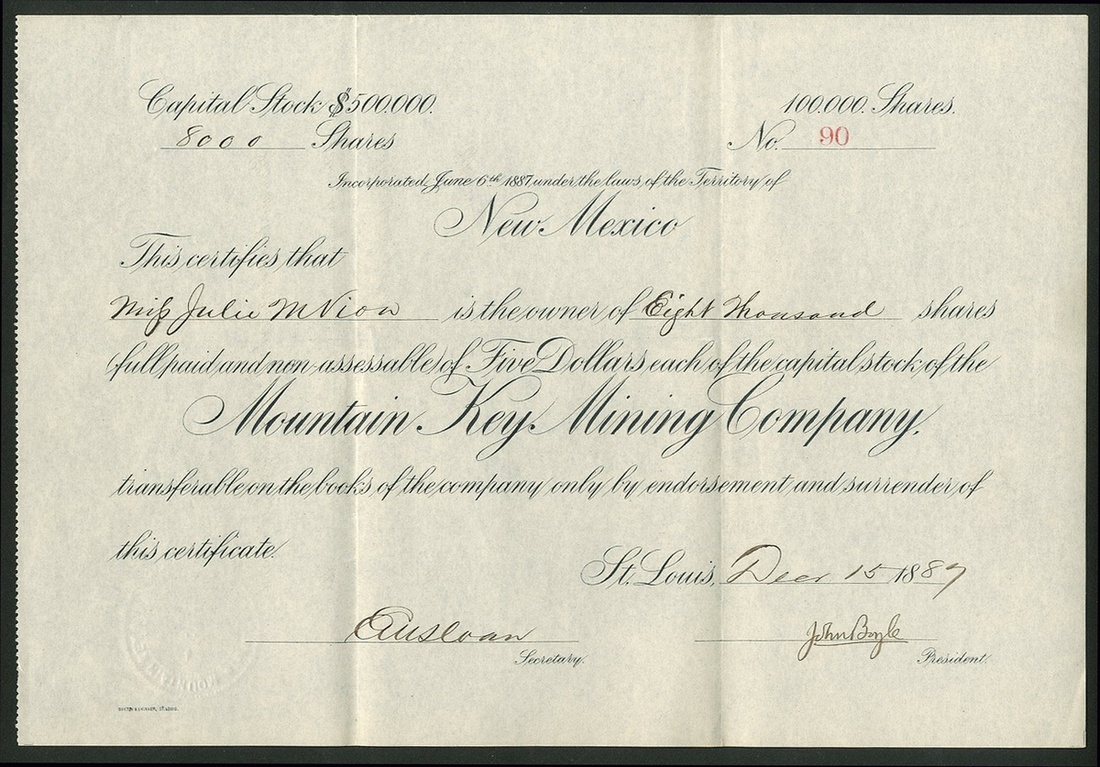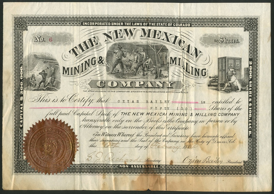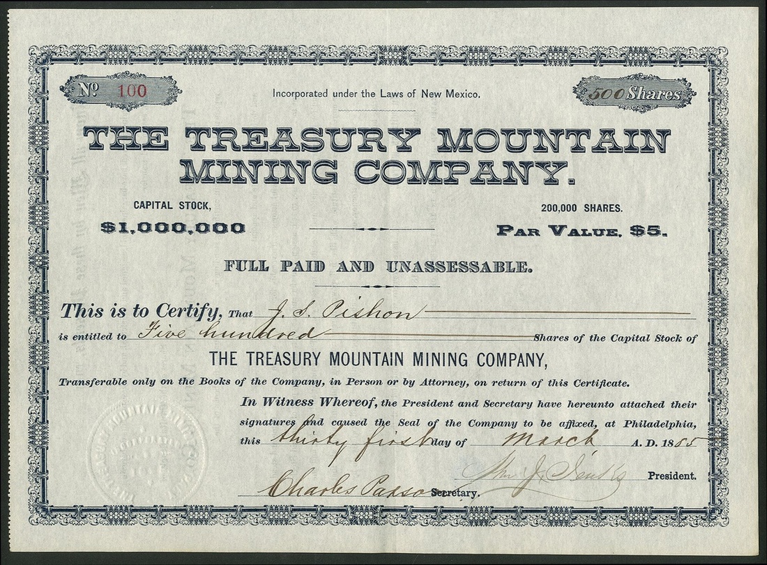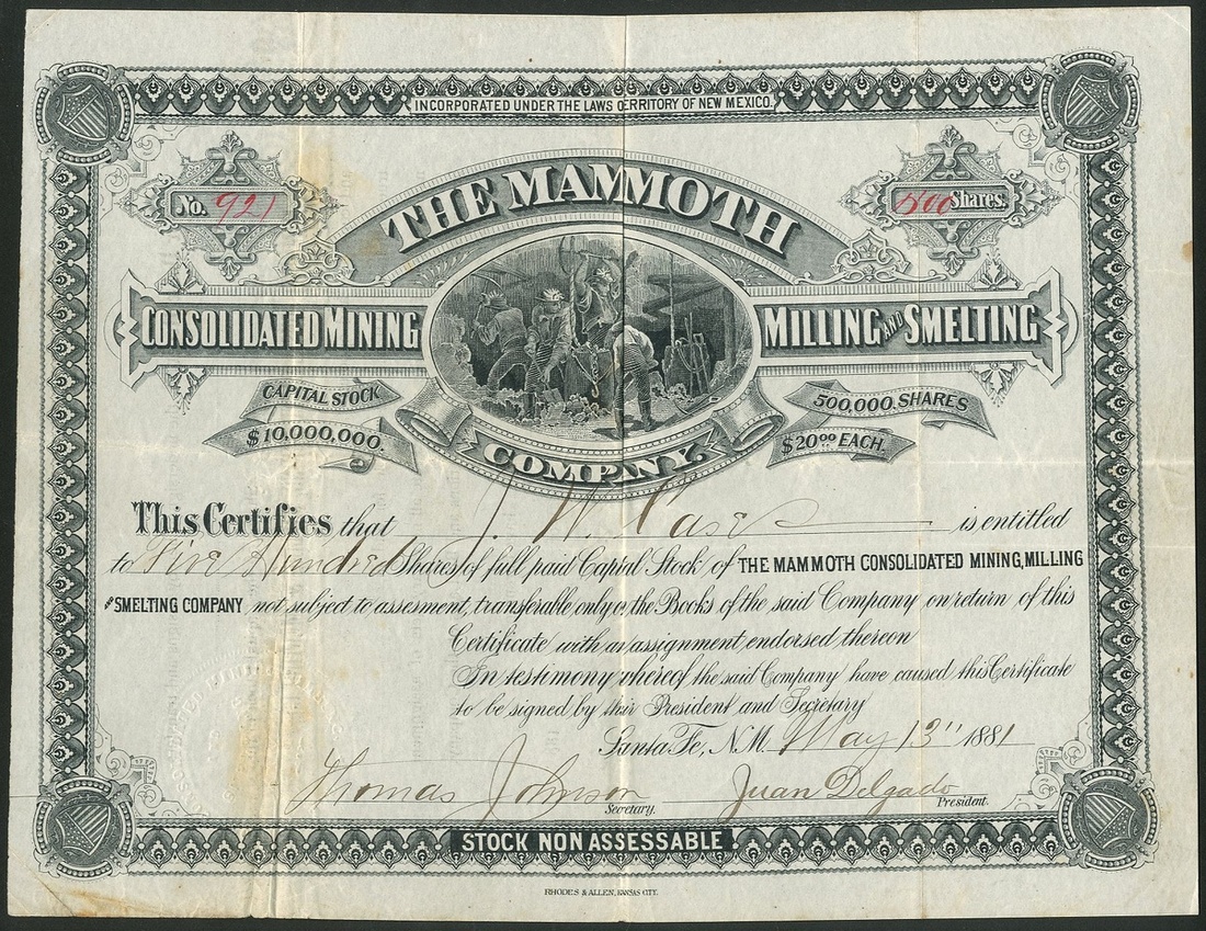 Collection of New Mexico Gold mining companies, comprising Mammoth Consolidated Mining Milling and smelting Co., 1881, black; Manzano Gold Mining Co., 1888, black on buff; Pacific Gold Co., 1889, Mountain Key Mining Co., 1887; Treasury Mountain Mining Co., 1885; San Pedro Placer Mining Co., 189-, and New Mexican Mining and Milling Co., 1884. Several with heavy creasing and some discolouration, most only F - VF (7).