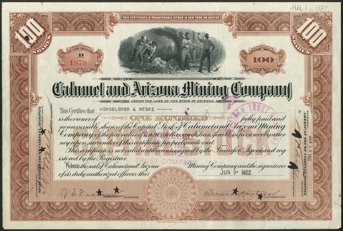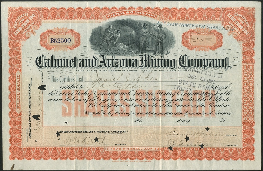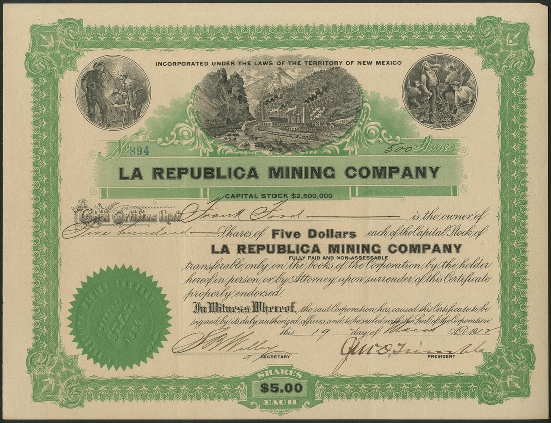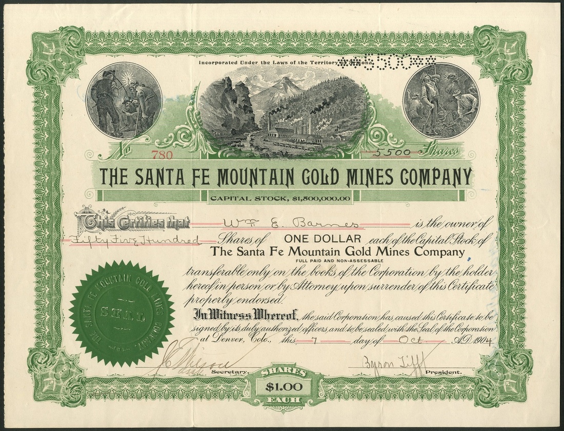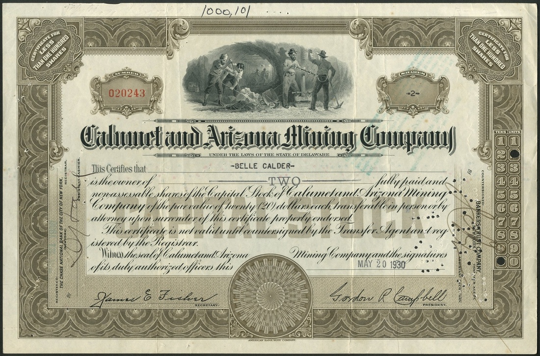 A group of western mining companies, comprising Highland Mining and Milling Company (MT), 50 cent shares, 190[1], #42, owned the Comstock Lode in the Newport Mining District, Washington; Santa Fe Mountain Gold Mines Company, $1 shares, 190[4], #780, owned property in Clear Creek County, Colorado; Blanche Copper Mining Co. (WY), $1 shares, 190[4], #305, Albany County, Wyoming; La Republica Mining Company (NM), $5 shares, 19[12], #894, claims in the Ocampa district, Chihuahua, Mexico; Colorado Fuel and Iron Co., 100 shares, 190[2], #10188, cancelled; Calumet and Arizona Mining Co., 5 different certificates, various colours, all cancelled, and, one other. Mostly VF, some better (11).
