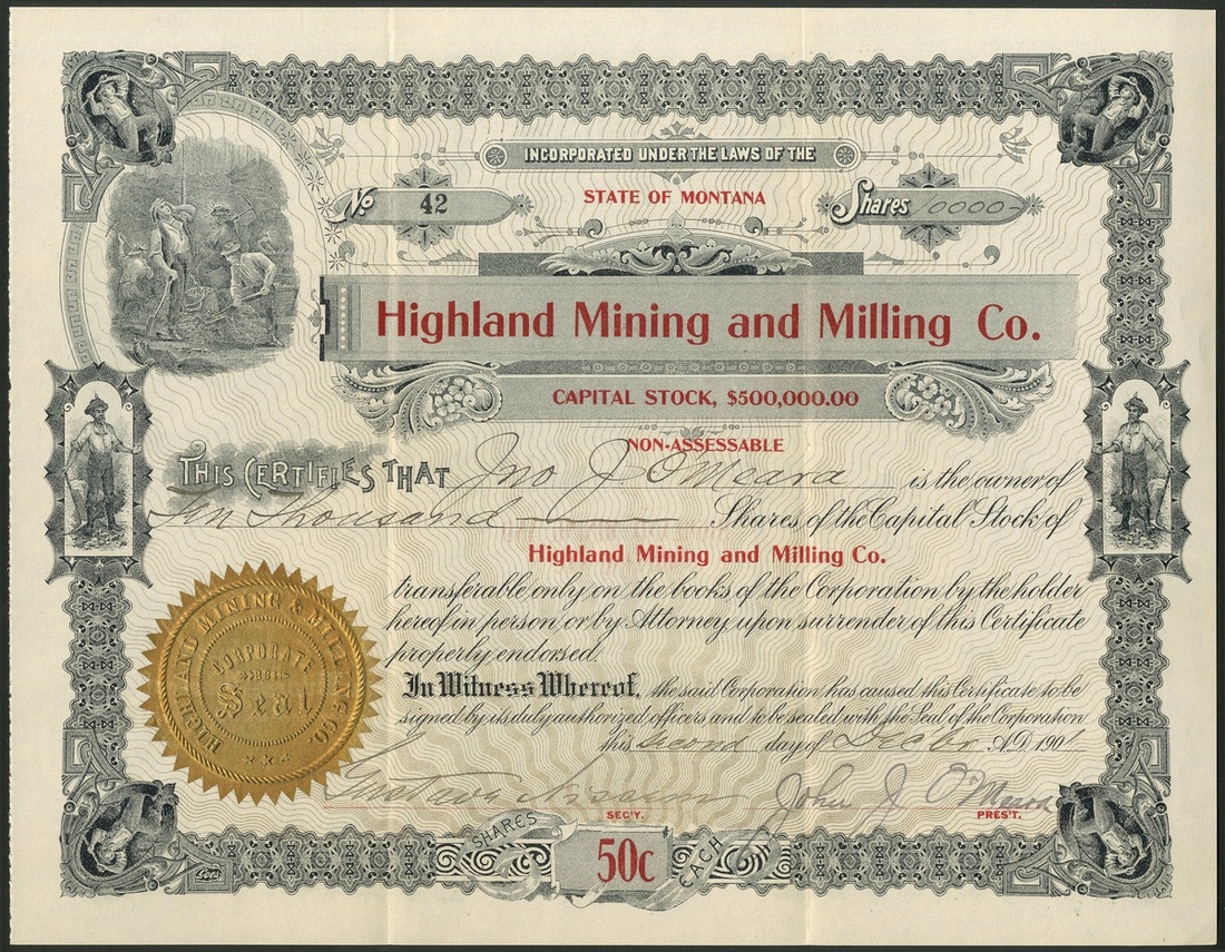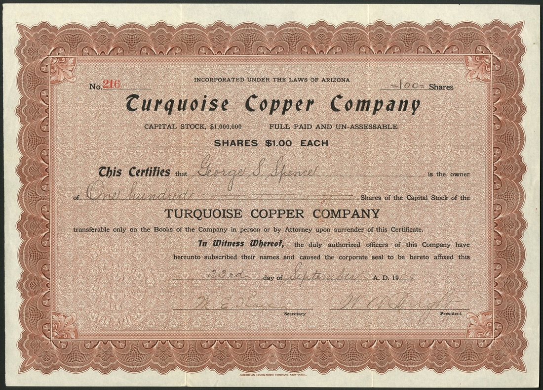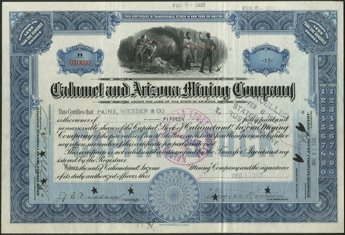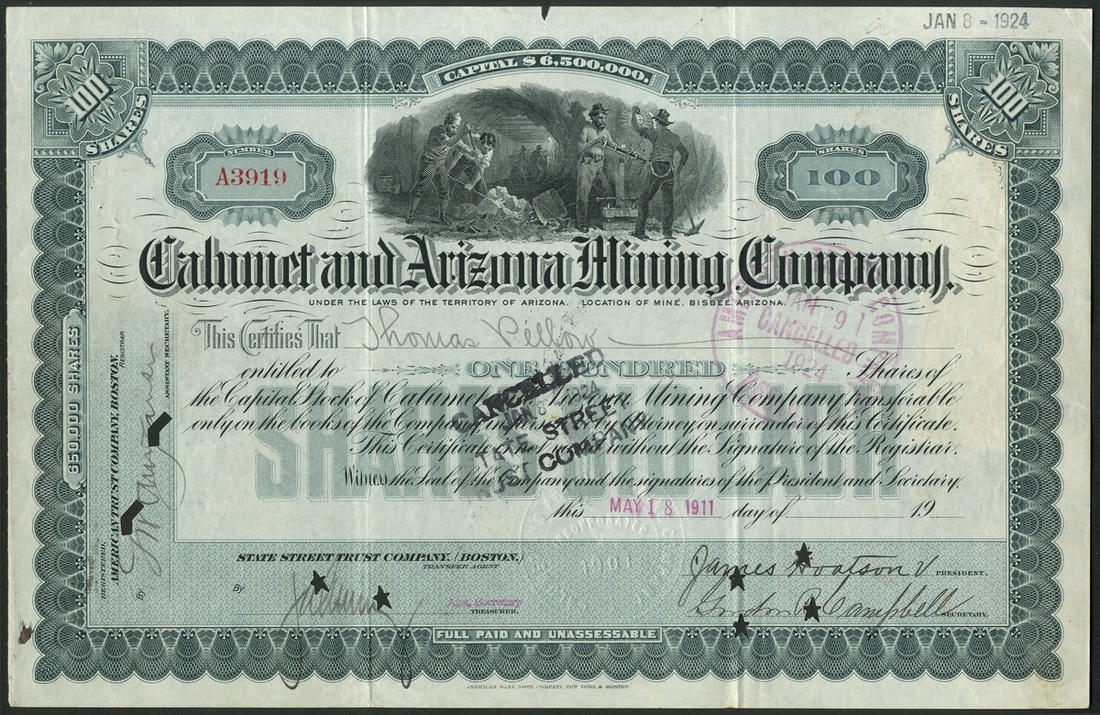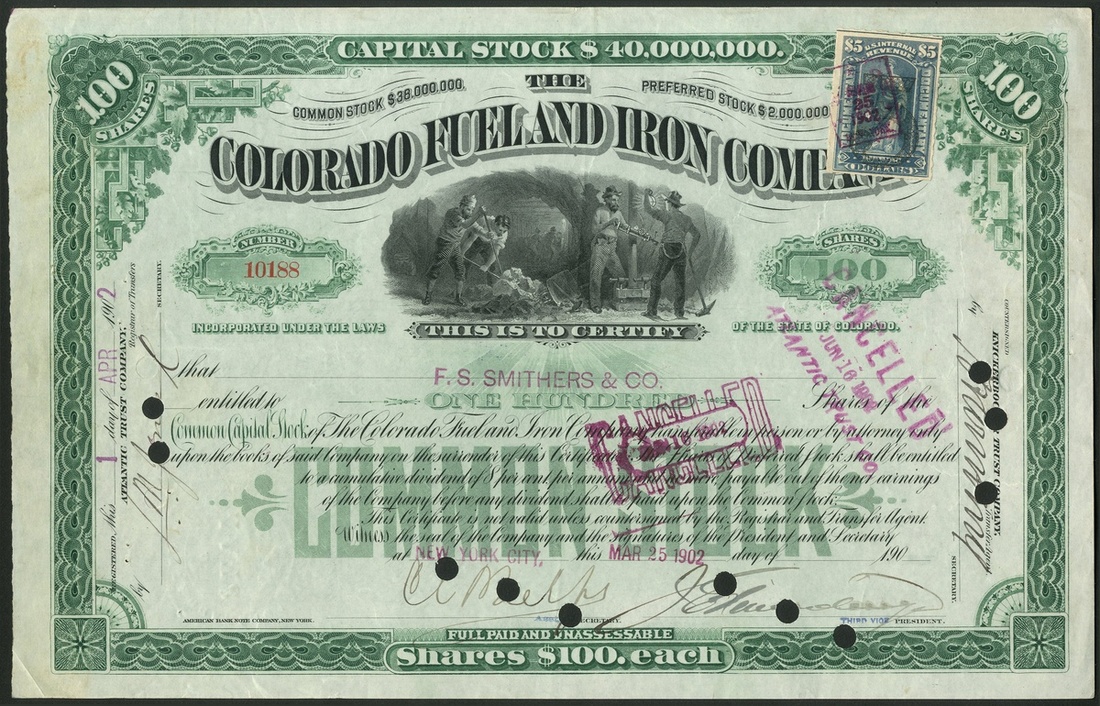 A group of western mining companies, comprising Highland Mining and Milling Company (MT), 50 cent shares, 190[1], #42, owned the Comstock Lode in the Newport Mining District, Washington; Santa Fe Mountain Gold Mines Company, $1 shares, 190[4], #780, owned property in Clear Creek County, Colorado; Blanche Copper Mining Co. (WY), $1 shares, 190[4], #305, Albany County, Wyoming; La Republica Mining Company (NM), $5 shares, 19[12], #894, claims in the Ocampa district, Chihuahua, Mexico; Colorado Fuel and Iron Co., 100 shares, 190[2], #10188, cancelled; Calumet and Arizona Mining Co., 5 different certificates, various colours, all cancelled, and, one other. Mostly VF, some better (11).