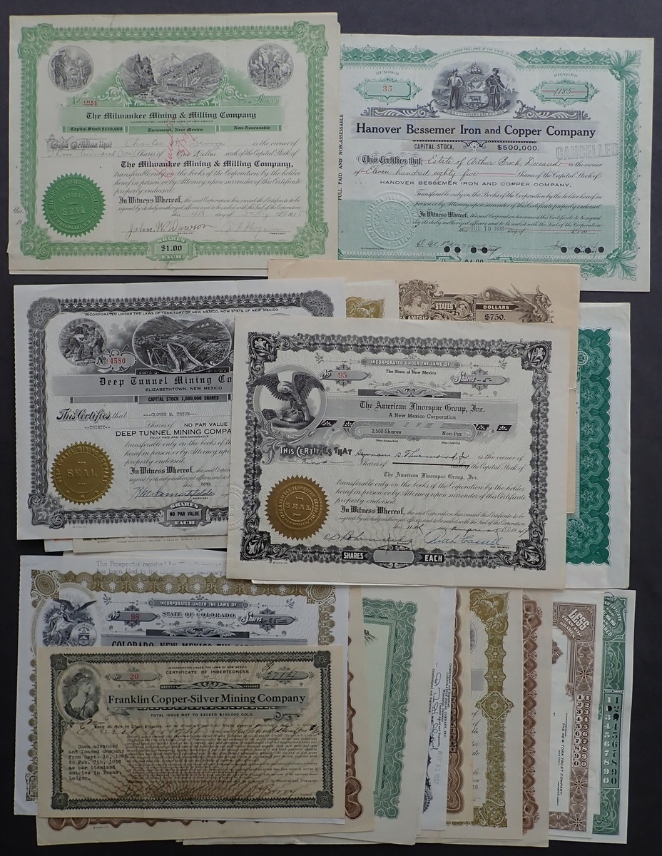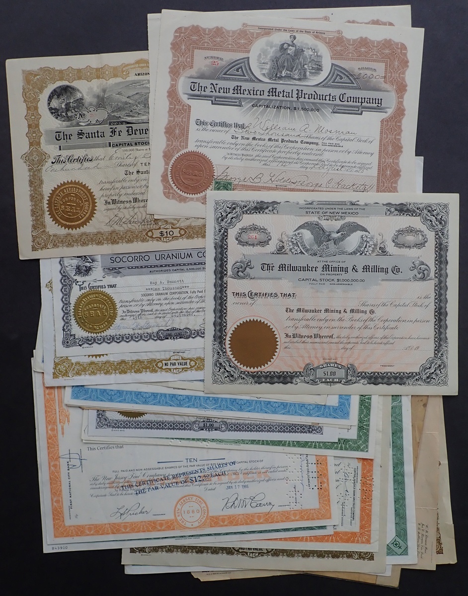 Mining: A large group of mining certificates. 26 dated from 1910 to 1947 and another 23 dated after 1950, many incorporated in New Mexico. A few unissued, a few cancelled. Mixed condition, many VF (49).