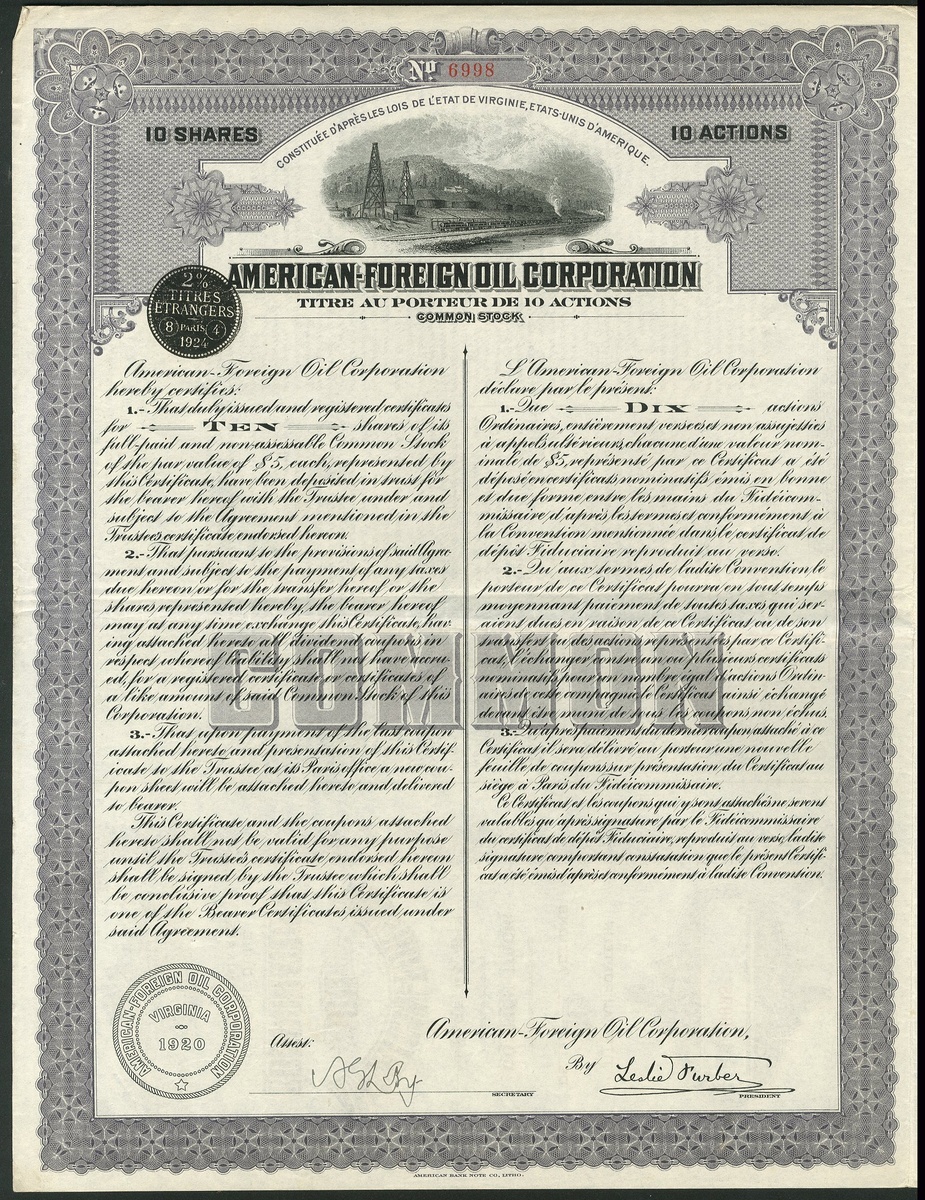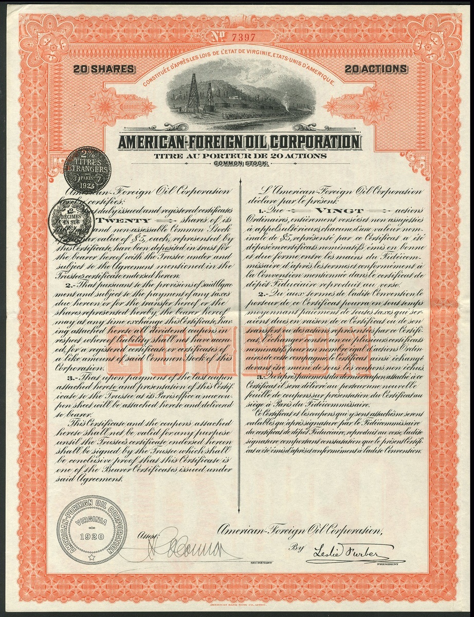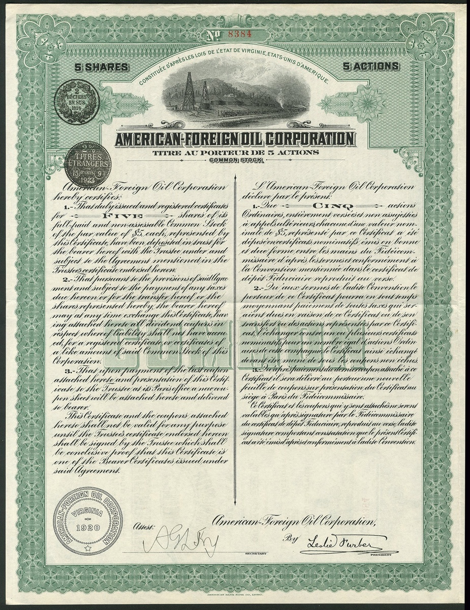 American-Foreign Oil Corporation, set of 3 certificates for 5, 10 and 20 shares, 1920, oilfield and steam train at top, ornate borders, green, mauve and orange respectively, text in English and French, with coupons, VF (3).