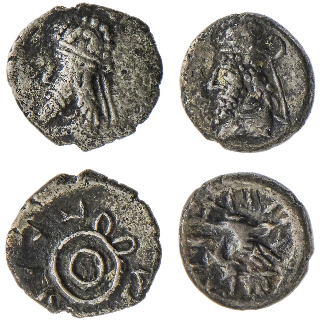 Kings of Persis. Unknown Kings. Pair of AR Obols, 1st Century AD. 0.6 gms. Bust left wearing Parthian-style tiara / Uncertain - blundered bust?; Unknown King 2 Prince "Y"? 0.4 gms. Bust left wearing Parthian-style tiara / Two concentric circles with two loops on outer circle. Good Very Fine. (2)