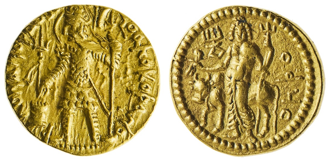 Kushan Empire. Vasudeva I (ca. 190-230). Gold Dinara. Baktrian mint, likely at Balkh. 8.04 gms. Vasudeva standing facing, head left, sacrificing at altar and holding trident, second trident before him, rev. Siva and Nandi the bull, tamgha upper left, "ohpo". Donum Burns 413-9. Scrape upper obverse. Very Fine.