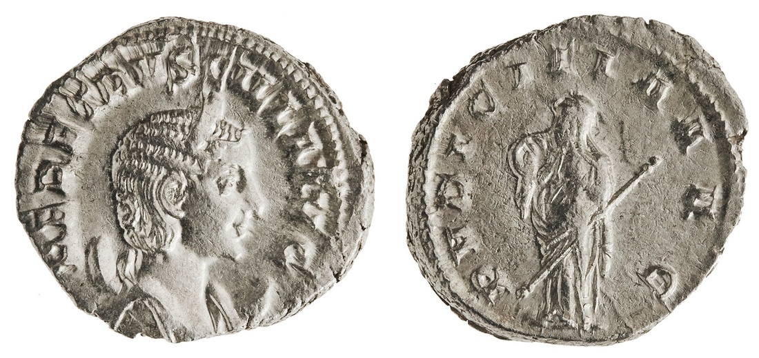 Roman Imperial. Herennia Etruscilla, Augusta (249-251). AR Antoninianus. 4.6 gms. Diademed bust right on crescent, rev. Pudicitia standing left, holding scepter and drawing back her veil. RIC (Decius) 58b. Extremely Fine, lustrous.