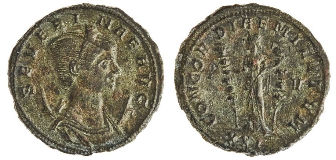 Roman Imperial. Severina, Augusta (270-275). Billon Antoninianus. Siscia, fifth Officina. Draped bust right wearing stephane, set on crescent, rev. Concordia standing left, holding signum in each hand, XXI in ex. RIC 13. Deep olive-green. Near EF.