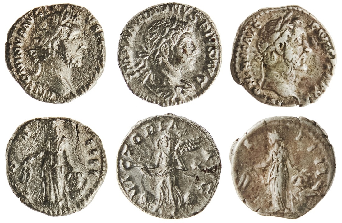 Roman Imperial Trio of AR Denarii. Antoninus Pius (138-161) - Rvs. Annona standing left, modius behind; goddess standing left. VF; Elagabalus (218-222). Rv. Victory left. Near EF. (3)