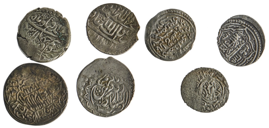 Islamic. Assortment of Persian Silver issues. Ilkhanid. Ghazan Mahmud (AH 694-703/1295-1304 AD). Post-reform AR Dirham -trilingual types (2); Timurid. Timur (Tamerlane), AH 771-807/1370-1405 AD. AR 2 Dinar, Furg AH 789. Struck during Timur's invasion of the Muzaffarid realm. Rare mint; Safavid. Isma'il I (AH 907-930/1501-1524 AD). AR Half Shahi, Mashhad, AH 924; Zand. Karim Khan (AH 1166-1193/1753-1779 AD). AR Abbasi (2). Dar al-Sultanat Qazwin AH 117x, and Rasht, nd; and Qajar. Agha Muhammad Khan (AH 1193-1211/1779-1797 AD). AR Light Rupi, Yazd, nd. Type C. 10.4 gms. Light deposits. Very Fine-Good VF. (7)
