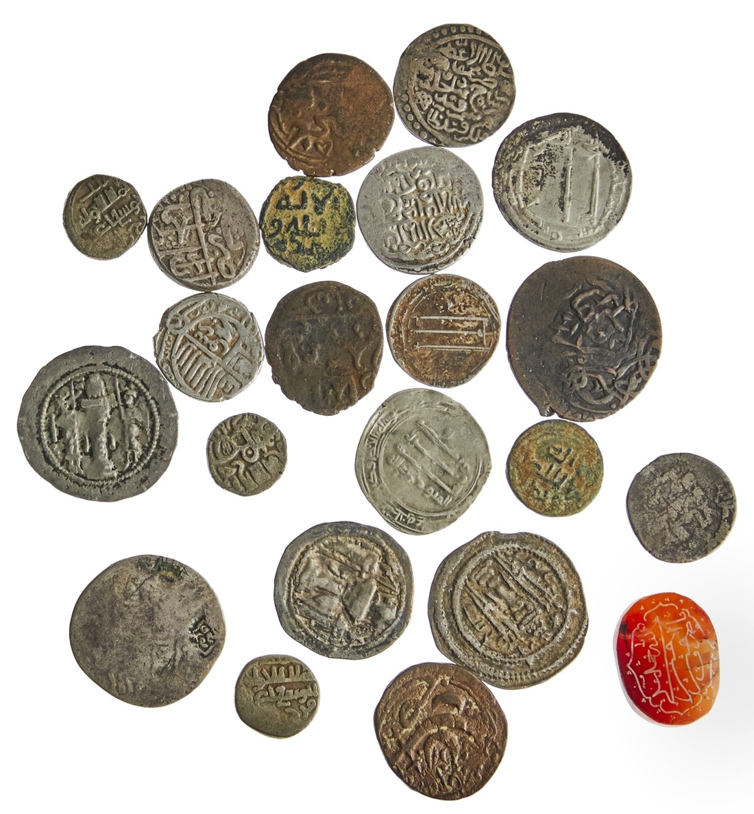 Islamic - Assortment of Types and Dynasties. Includes: Abbasid Dirham (3 - one with hornsilver); Umayyad AEs (2); Rasulid Dirham (lion); Timurid Tanka (3); Khwarezmshah Billon/Lead Dawar-region, horseman-type Jitals (12); Ghaznavid AR and Jitals (3); Giray Khan AR Akce, Kaffa AH 900; Amir of Qunduz AE; c/m'd AR; Rum Seljuq AE; Afghan AR and AEs (2); Hejaz & Nejd ½ Ghirsh AH 1348; Saudi Ghirsh AH 1356 plain edge; also Norman Sicily, William II (1166-1189) AE ½ Follaro Latin/Kufic legends; Sassanian Drachm (3); and a 19th Century Persian carnelian prayerstone (chipped). VG-VF. (38)