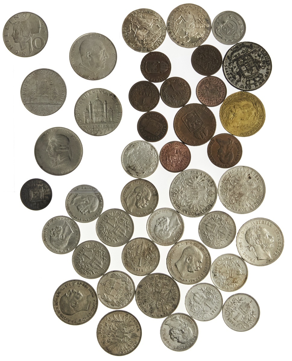 Austria. Franz Josef-Republik. Diverse silver issues. Franz Josef: Florins (3), 2 Corona (4), Corona (9), Hungarian 1915 Korona (5). VF-Unc. Republik. Commemorative 2 Schilling - 1928 Schubert, 1932 Haydn, 1933 Seipel, 1937 St. Charles Church (2); silver minors (2), Unc.; also Galicia & Lodomeria. 30 Kreuzer, 1775 IC-FA. F/VF once polished; Austrian Netherlands AE, Medallic 1963 "Ferdinand Charles" silver pieces (2), 19th Century AE Minors (9), other. (42)