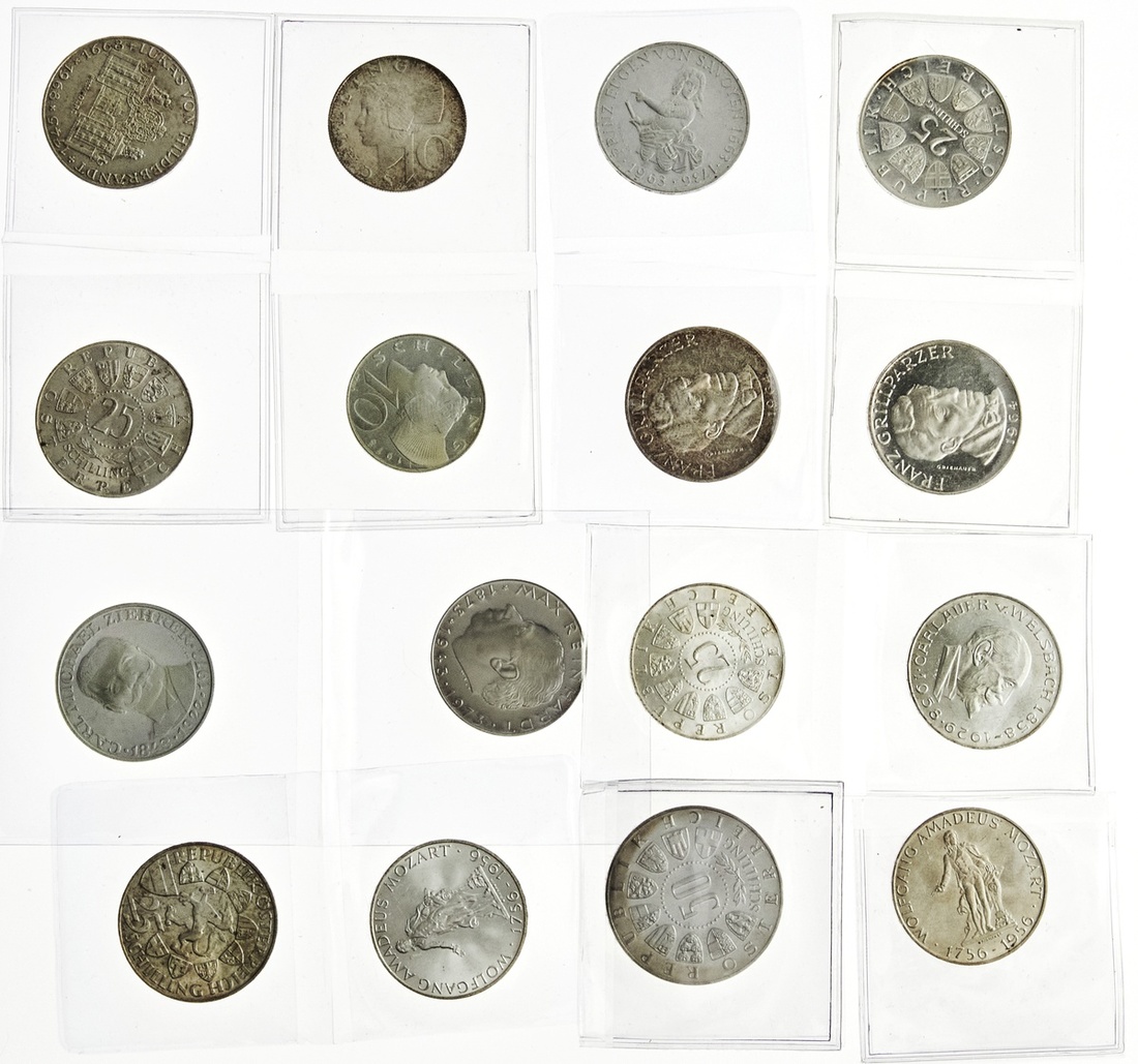 Austria. Republik. Assortment of Modern Silver Commemoratives. 25 Schillings - 1955 National Theatre (2), 1956 Mozart (3), 1957 Mariazell (2), 1958 Welsbach (2), 1959 Archduke Johann, 1960 Carinthian, 1963 Prince Eugen, 1964 Grillparzer (3), 1965 Vienna Tech, 1968 V. Hildebrandt, 1972 Ziehrer, 1973 Reinhardt. AU-Brilliant Proof; 50 Schillings - 1964 Olympics, 1967 Blue Danube Waltz, 1974 Salzburg Cathedral. Brilliant Proof; 100 Schillings, 1973 Strauss. Unc.; and Proof 10 Schillings, 1964, 1973. (25)