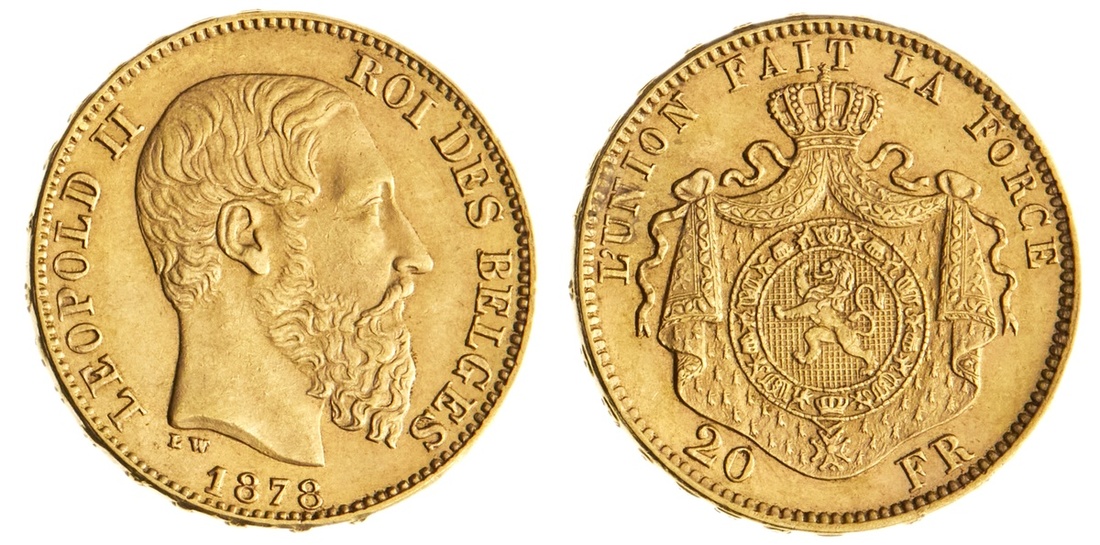Belgium. Leopold II (1865-1909). 20 Francs, 1878. Bare head right, rev. Crowned and mantled Arms. KM 37. About Uncirculated.