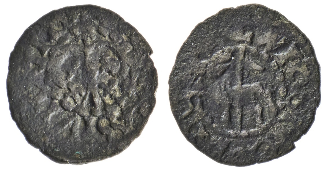 Denmark. Gotland. After 1361. AE Penning. Visby. Lily with fleurs on tripod between two crosses; +MONETA CIVITATIS, rev. Arms of Gotland - Lamb left, no nimbus, with standard.; WISBVCENSIS. Lagerqvist XXXV, A.1a. Rare. Olive-brown. Fine.