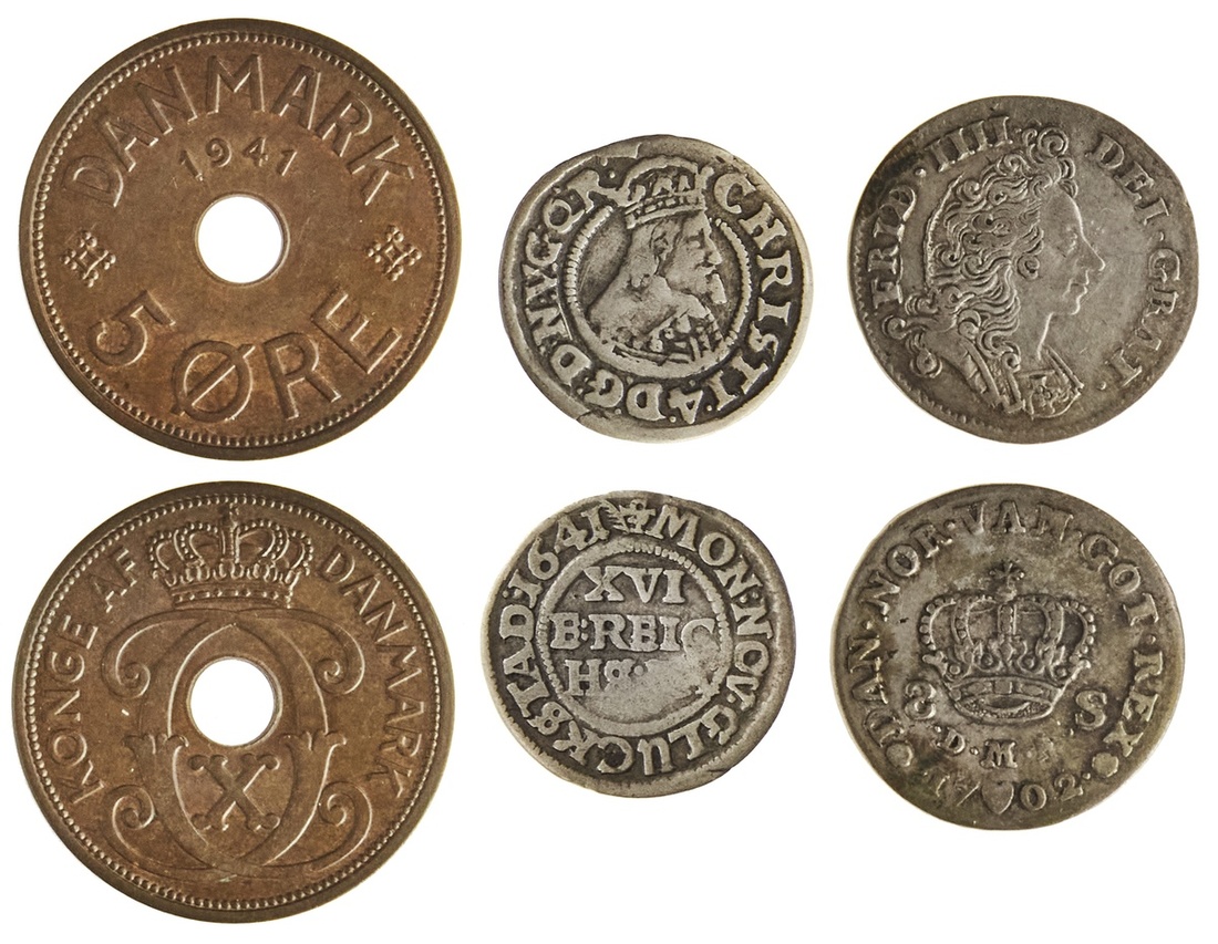 Denmark. Pair of silver minors. Frederik IV. 8 Skilling, 1702. Draped and cuirassed bust right. KM 470. Good Very Fine. Glückstadt. Christian IV. 1/16 Speciedaler, 1641. Crowned bust right. KM 26, Sieg 170.2; Fine; and Faeroe Island. 5 Øre, 1941. Uncirculated. (3)