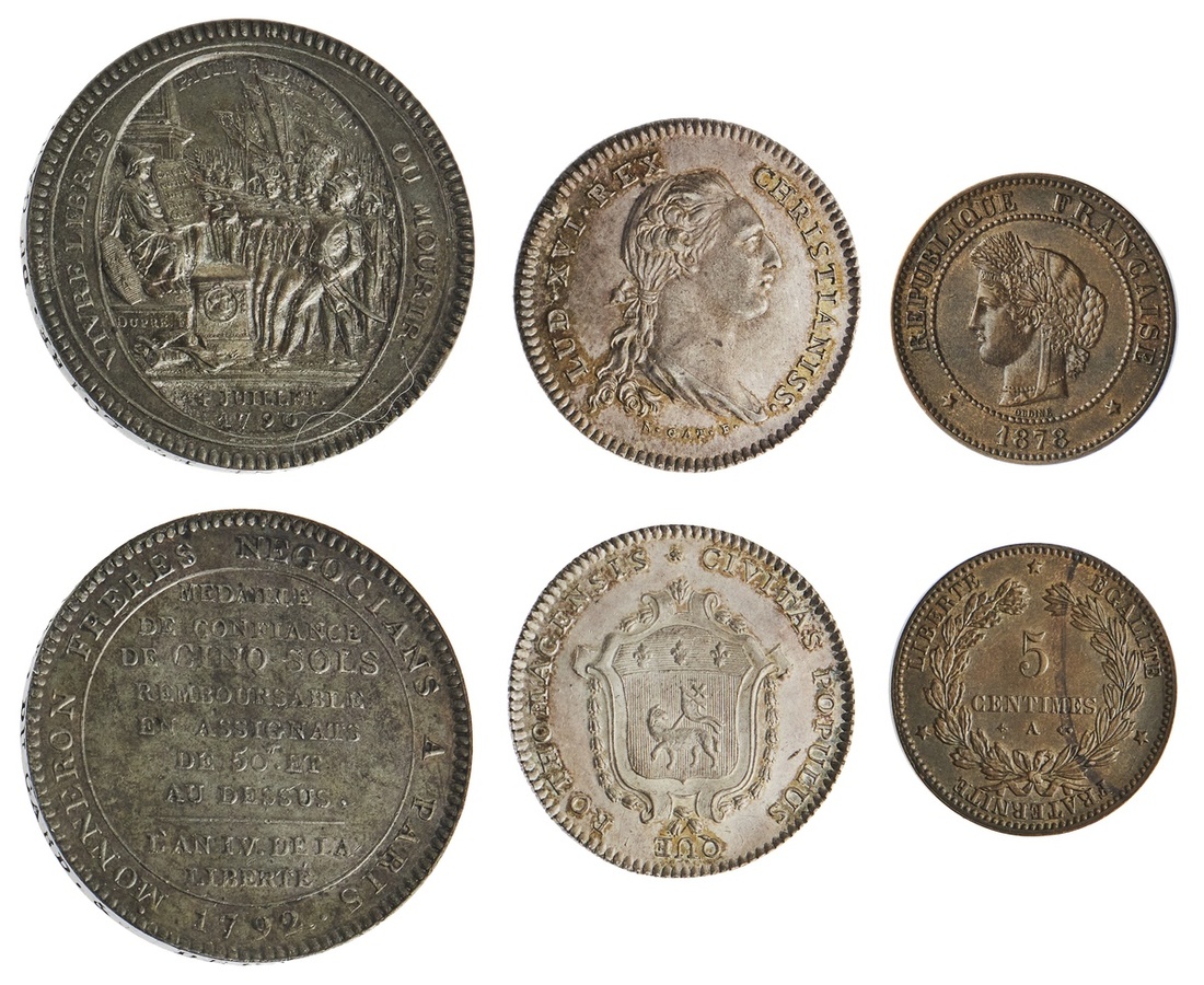 France. Louis XVI-Third Republic. Trio. Constituency. Token 5 Sols, 1792. KM Tn31. Choice EF; Third Republic. 5 Centimes, 1878 A, Key date. Choice EF; Rouen. Silver Jeton, 1775. Uncirculated. (3)