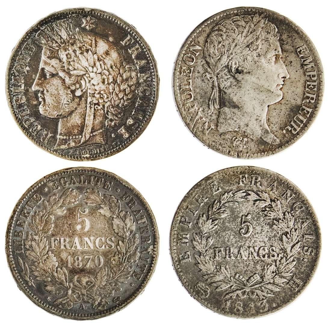 France. Pair of 5 Francs: Napoleon I, as Emperor (1804-1814). 1813 H. la Rochelle. Laureate head right. KM 694.6. Light obverse adjustment marks. Good Very Fine; Third Republic. 1870 A. Paris. Wreathed Ceres head by Oudiné left. KM 818.1. Deep gray over a few contact marks. Very Fine. (2)