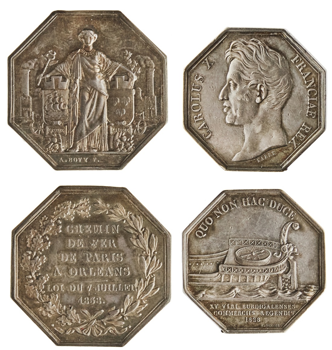 France. Charles X-Louis-Philippe. Pair of Octagonal silver Jetons. Bordeaux Chamber of Commerce, 1828. 33mm. By Barre and Dubois. Charles X head left, rev. Ornate ancient prow with compass; Railway from Paris to Orleans, 1838. 36.5mm. By Bovy. France standing facing before City Arms of Paris and Orleans and steam locomotive, rev. Six-line legend within wreath. EF. (2).