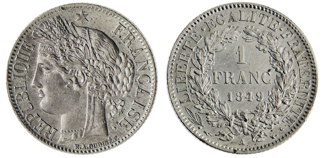 France. Second Republic. Franc, 1849 A. Paris. Ceres/Liberty head left, rev. Value and date within wreath. KM 759.1. Satin lustre. Uncirculated.
